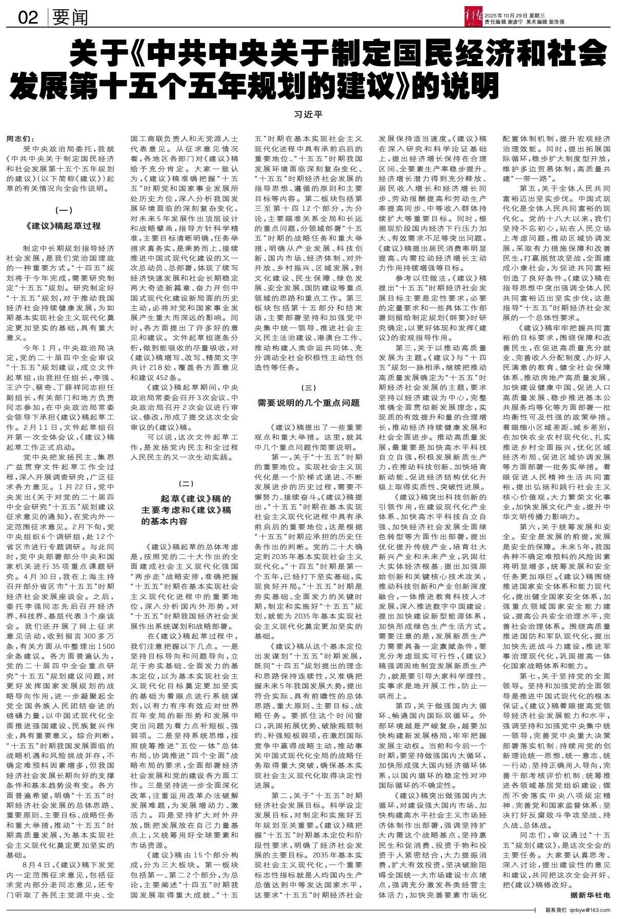 习近平 同志们: 受中央政治局委托,我就《中共中央关于制定国民经济和社会发展第十五个五年规划的建议》(以下简称《建议》)起草的有关情况向全会作说明。 (一)
