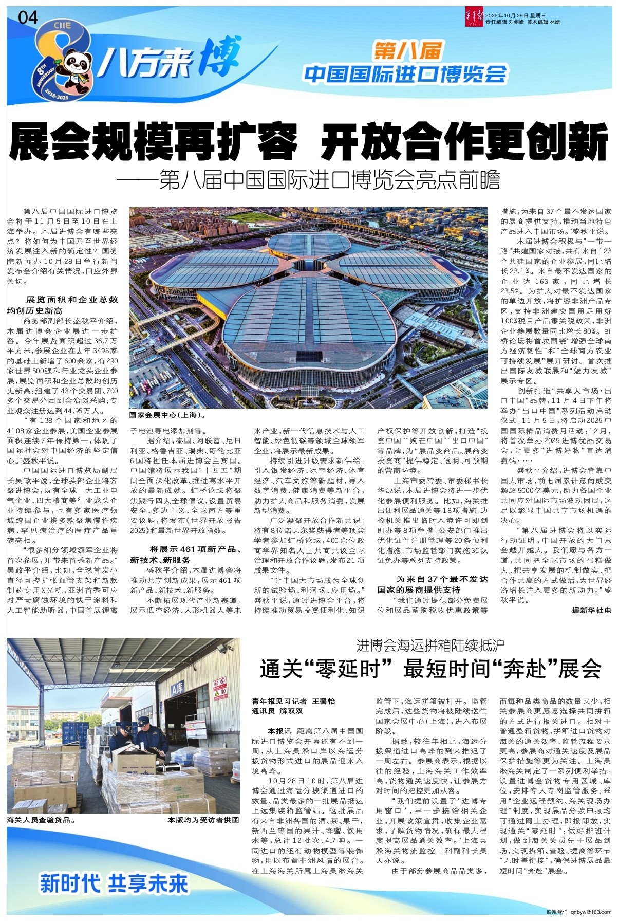 - 通关“零延时” 最短时间“奔赴”展会 青年报见习记者 王馨怡 通讯员 解双双 本报讯 距离第八届中国国际进口博览会开幕还有不到一周,从上海吴淞口岸以海运分拨货物形式进口的展品迎来入境高峰。 10月28日10时