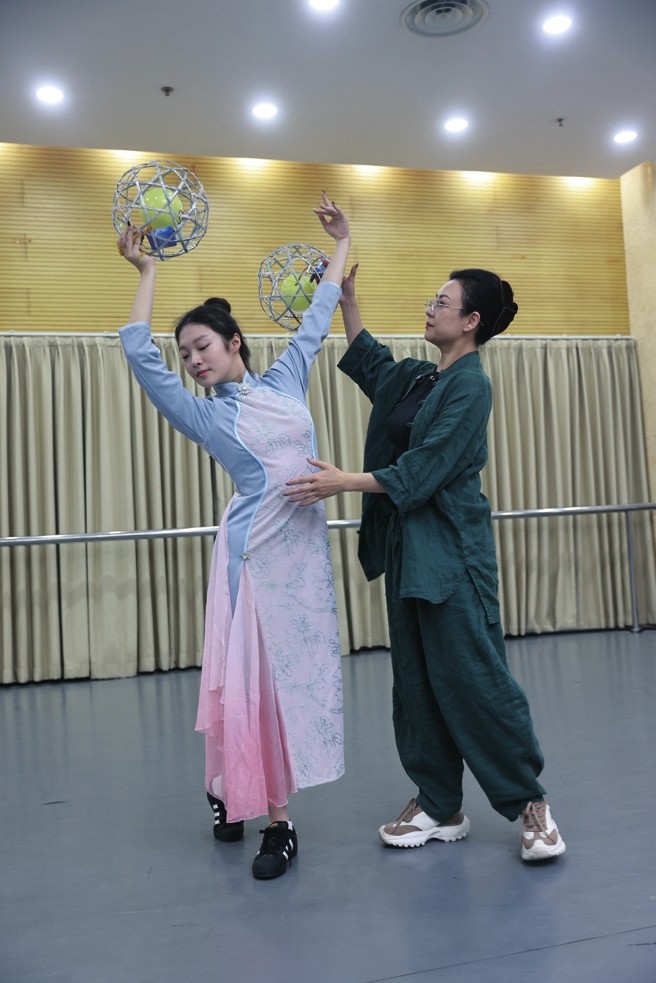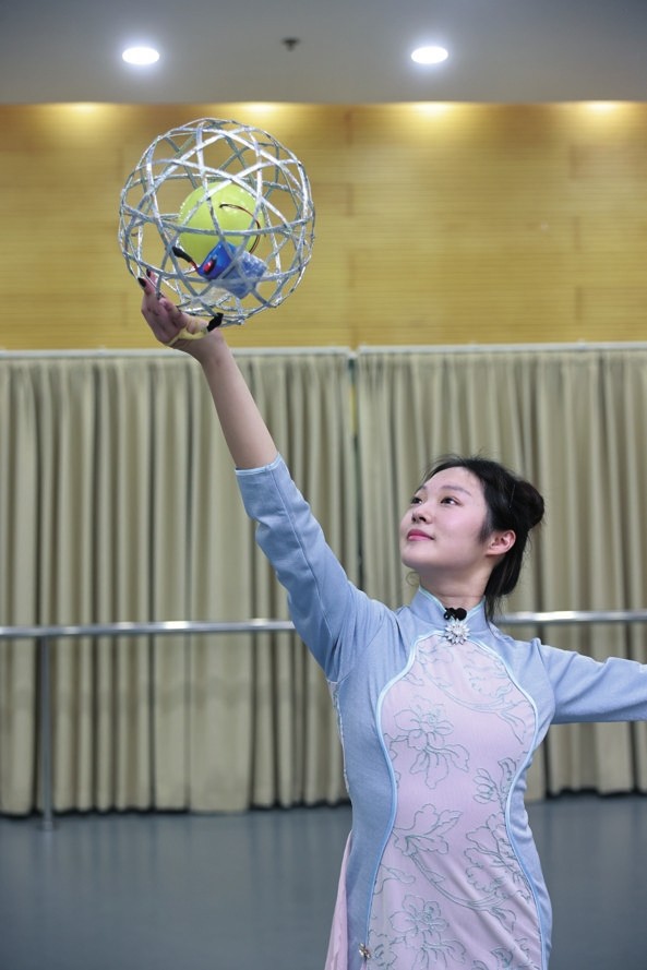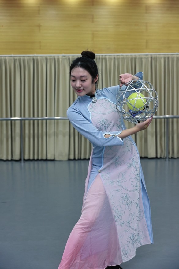 傅星悦和同伴每人都需要操控一个滚灯做的“雪球”。“最大的滚灯要装进一个人,去外地参赛运输得用卡车,不然根本装不下。”她笑着说。排练过程也不轻松,道具重,圆形结构在抛接时极难控制。“如果不放稳就会滚走,影响视觉效果。”更考验的是演员之间的配合,“两个人配合不好,球就接不住。”她说。