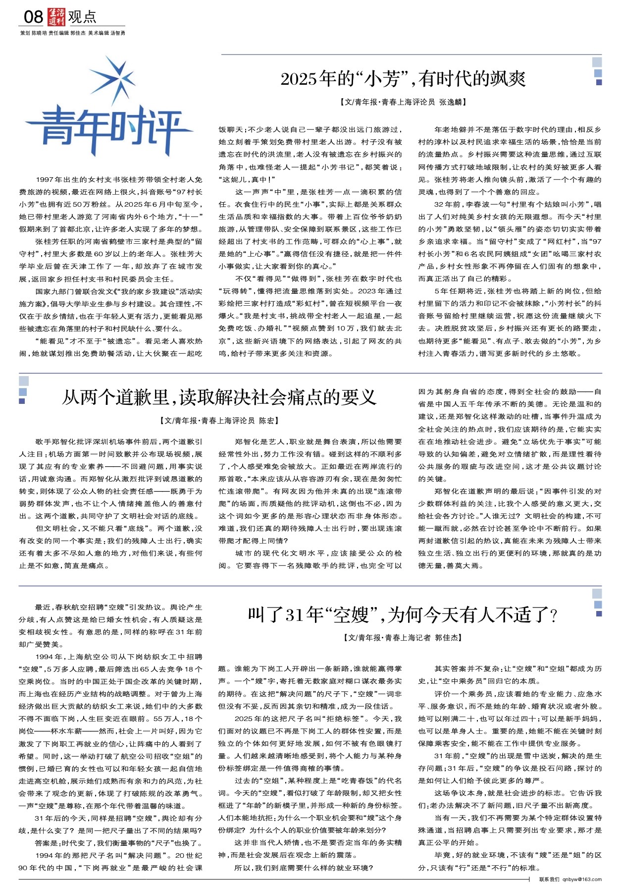 - 2025年的“小芳”,有时代的飒爽 【文/青年报·青春上海评论员 陈宏】 1997年出生的女村支书张桂芳带领全村老人免费旅游的视频,最近在网络上很火,抖音账号“97村长小芳”也拥有近50万粉丝。从2025年6月中旬至