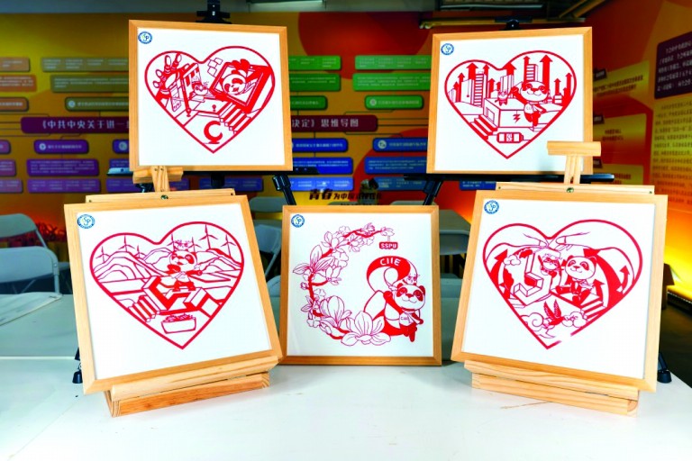 作品里,还特意嵌入了学校志愿者吉祥物“小工蚁”——憨态可掬的“小工蚁”与进博会吉祥物“进宝”在红纸间“并肩而行”,恰似二工大“小叶子”与进博会携手并进,用协作与坚守诠释“共赢”初心。