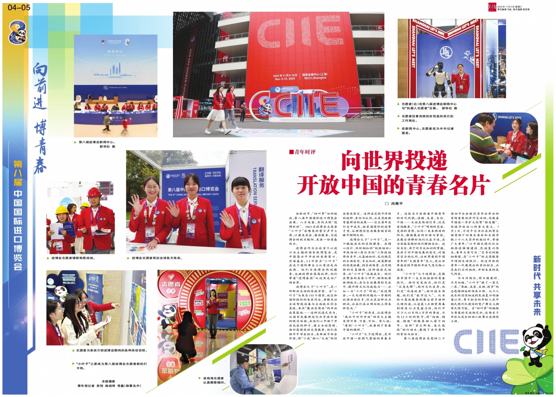 □ 尚青平 金秋时节,“四叶草”如约绽放,第八届中国国际进口博览会启幕。八方来客,共同点燃“进博时刻”。3865名进博会志愿者“小叶子”在嘹亮的誓言声中上岗,以最美笑容、最佳服务,