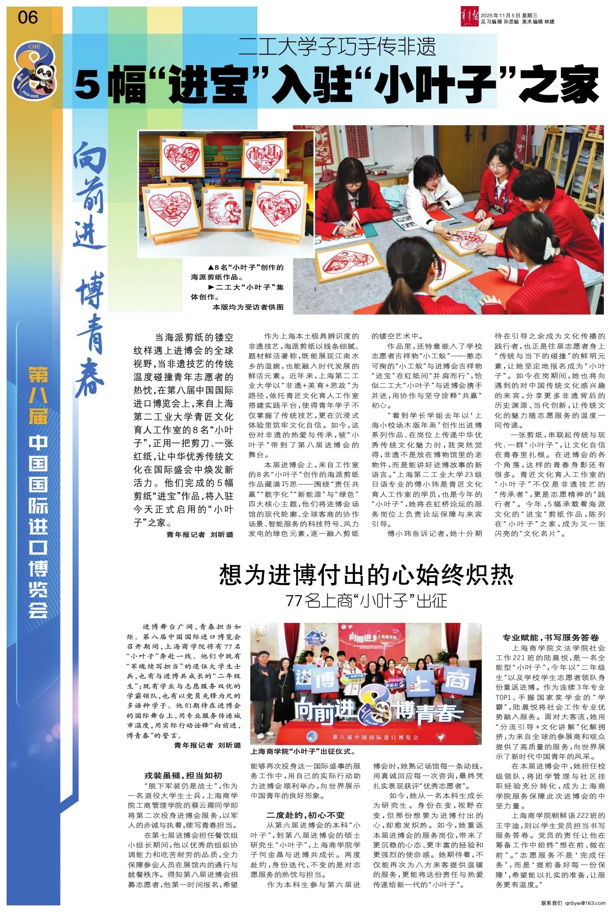 - 5幅“进宝”入驻“小叶子”之家 当海派剪纸的镂空纹样遇上进博会的全球视野,当非遗技艺的传统温度碰撞青年志愿者的热忱,在第八届中国国际进口博览会上,来自上海第二工业大学青匠文化育人工作室的8名“小叶子”,正用一把剪刀、一张红