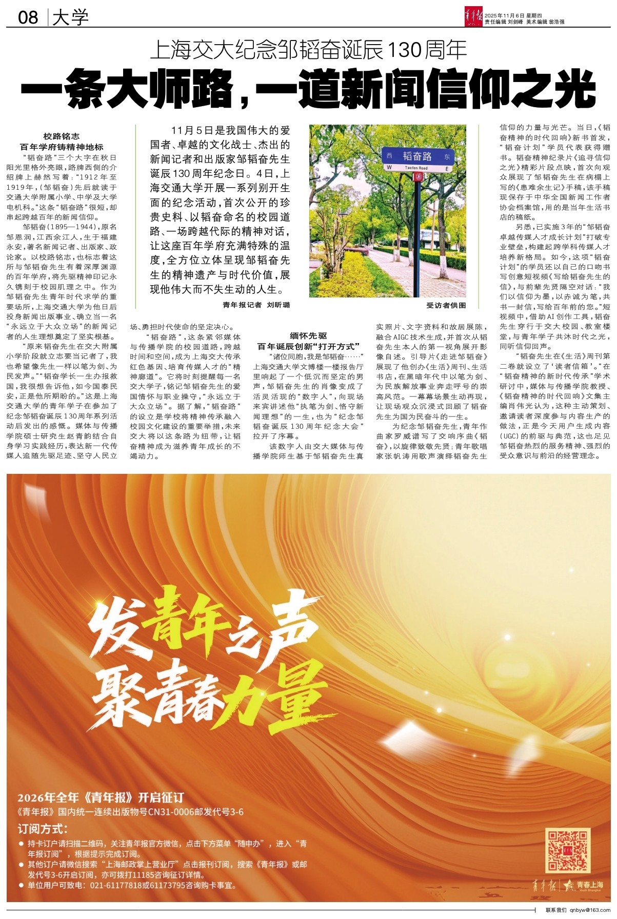 11月5日是我国伟大的爱国者、卓越的文化战士、杰出的新闻记者和出版家邹韬奋先生诞辰130周年纪念日。4日,上海交通大学开展一系列别开生面的纪念活动,首次公开的珍贵史料、以韬奋命名的校园道路、
