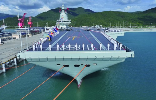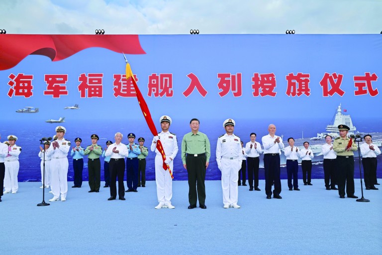 我国第一艘电磁弹射型航空母舰福建舰入列授旗仪式5日在海南三亚某军港举行。中共中央总书记、国家主席、中央军委主席习近平出席入列授旗仪式并登舰视察。
