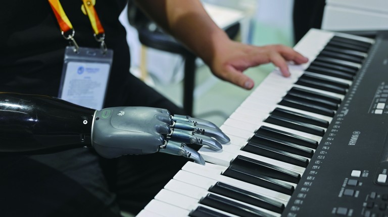 在第八届进博会浙江馆,一阵清澈的钢琴声吸引众人驻足。弹奏者姜颂宁神情专注,他的右臂腕部戴着一只智能仿生手,在琴键上灵活跃动。随后,他又从容展示了拿取易碎的豆腐、体验非遗陶艺——这双“巧手”的主人,是一名右臂缺失小臂的00后青年。