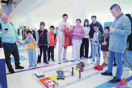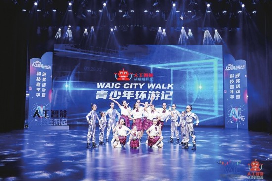 欢快的音乐声里,戴着墨镜、身穿科技感十足的银色服装的少年们登上舞台。从高校实验室到智能机器人工厂,大屏幕欢快闪动,画面随着他们的舞步流转,一场浓缩版的“WAIC CITY WALK青少年环游记”生动展开。几分钟时间,会场边界仿佛被打破,化作充满惊喜的AI体验主场。