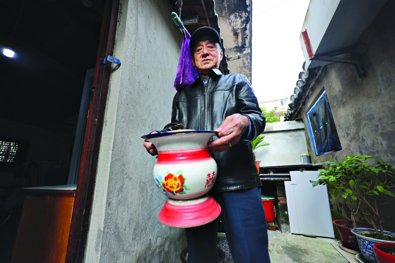 韩万权老人家的院子里,一个洗净的痰盂默默诉说着过往。“这个痰盂用了好几十年。”老人说,去年还在用的旧痰盂,曾经是家里的生活必需品,如今终于可以“下岗”了。