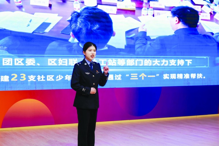 上海市公安局闵行分局民警胡芯雨,扎根社区警务工作五年,她深知公安社区少年服务队在党建引领基层社会治理中的重要性,推动全区23支服务队建设,通过完善架构,规范流程,研发模型,助力及早发现、帮扶“问题少年”。服务队成立一年多来,帮扶56名未成年人重回正轨,正如她这次的宣讲题目——《不让一个孩子掉队》。“我们通过预防青少年违法犯罪、化解涉青少年矛盾纠纷营造和谐稳定的社会环境,为推进国家治理体系和治理能力现代化贡献基层力量。未来,我们将持续以‘不让一个孩子掉队’的理念,用温度践行德法相伴,润心护苗,倾情守护未成年人健康成长。”胡芯雨说。