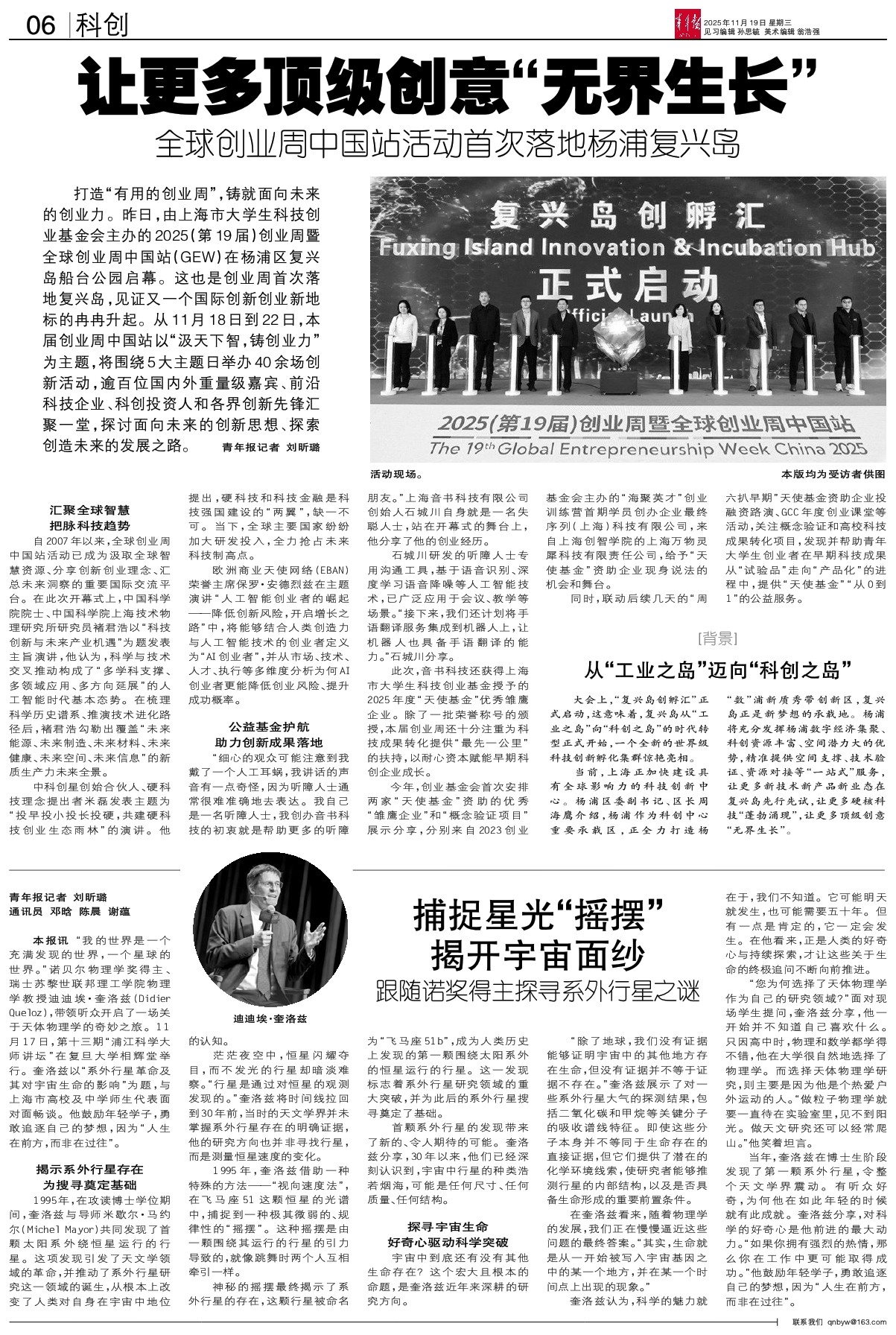- 捕捉星光“摇摆” 揭开宇宙面纱 青年报记者 刘昕璐 通讯员 邓晗 陈晨 谢蕴 本报讯 “我的世界是一个充满发现的世界,一个星球的世界。”诺贝尔物理学奖得主、瑞士苏黎世联邦理工学院物理学教授迪迪埃·奎洛兹(Didi