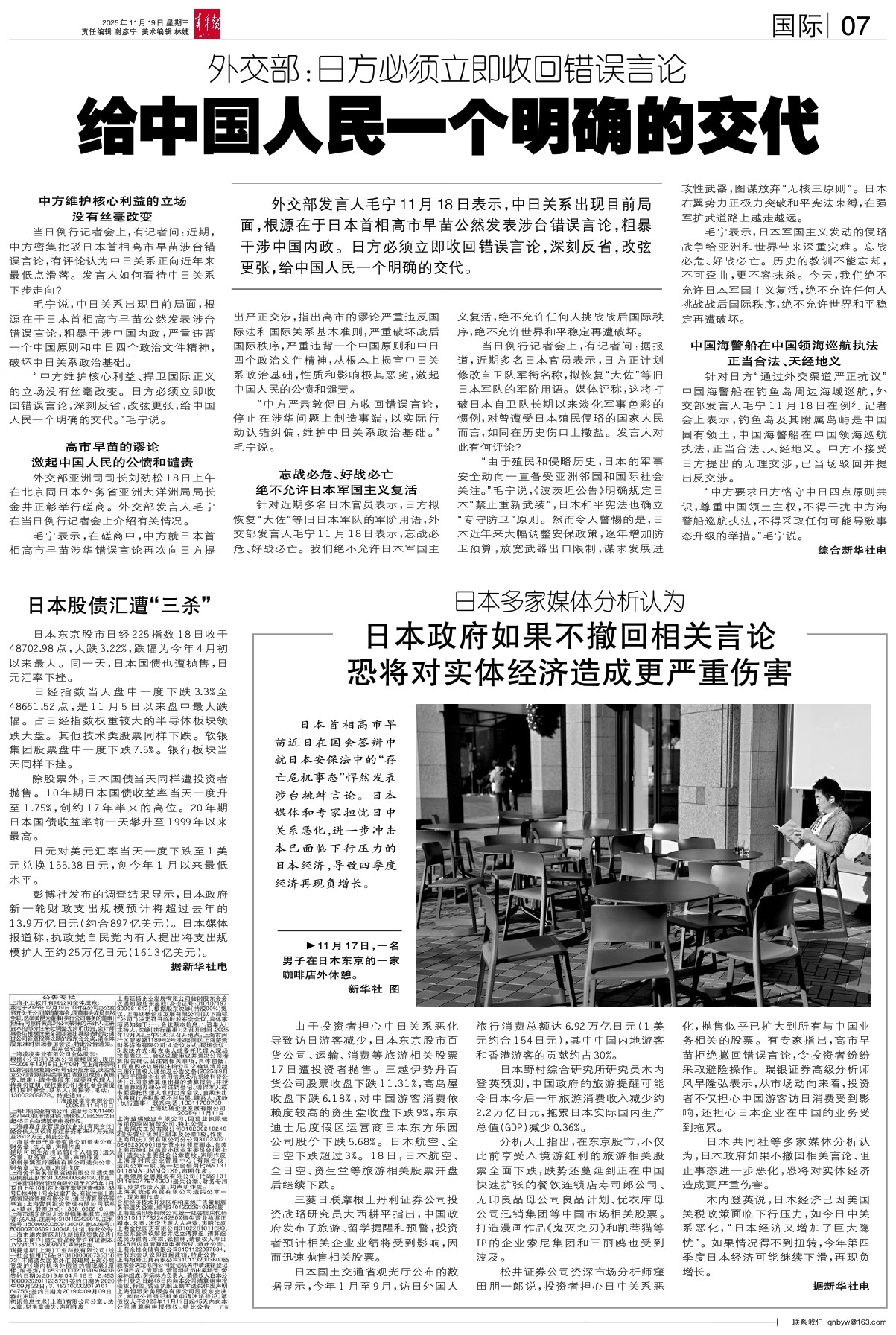- 给中国人民一个明确的交代 外交部发言人毛宁11月18日表示,中日关系出现目前局面,根源在于日本首相高市早苗公然发表涉台错误言论,粗暴干涉中国内政。日方必须立即收回错误言论,深刻反省,改弦更张,给中国人民一个明确的交代