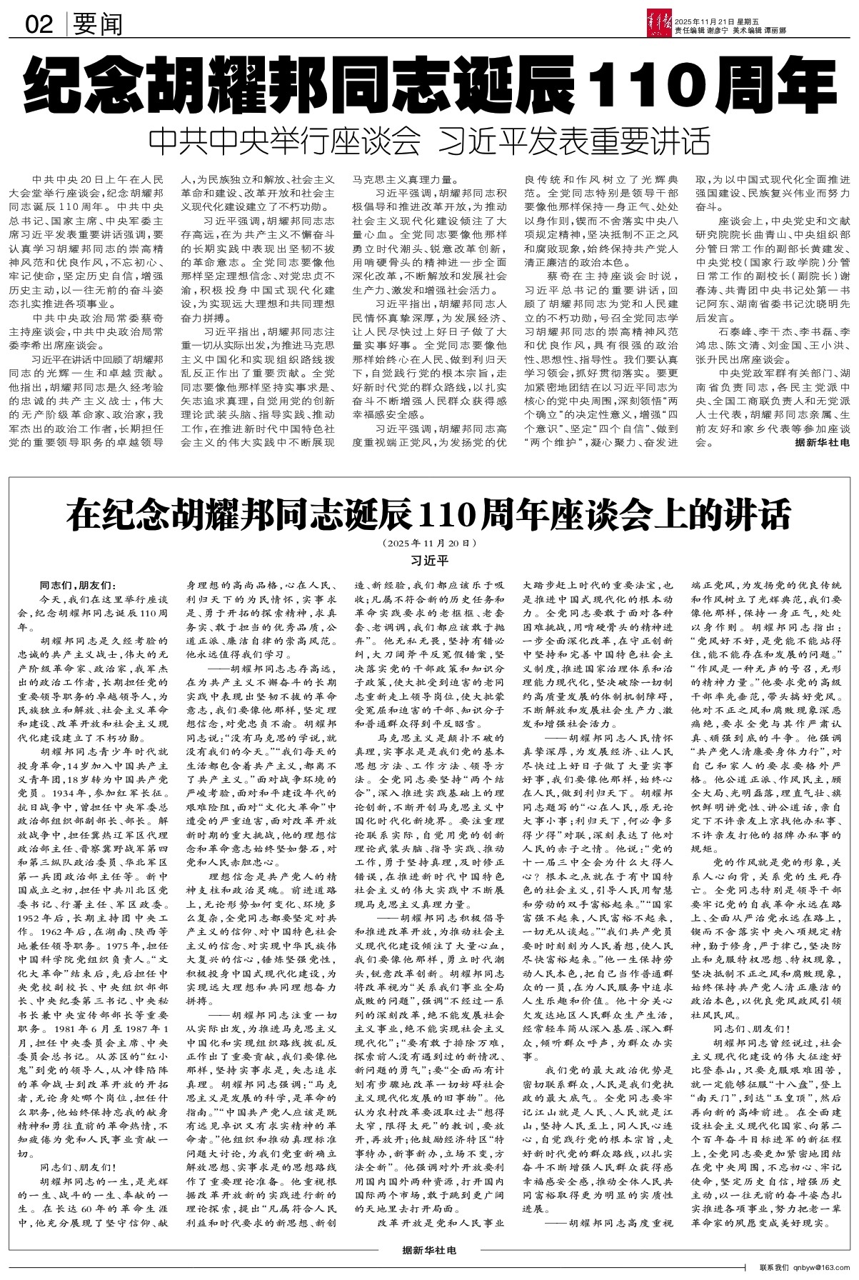 (2025年11月20日) 习近平 同志们,朋友们: 今天,我们在这里举行座谈会,纪念胡耀邦同志诞辰110周年。 胡耀邦同志是久经考验的忠诚的共产主义