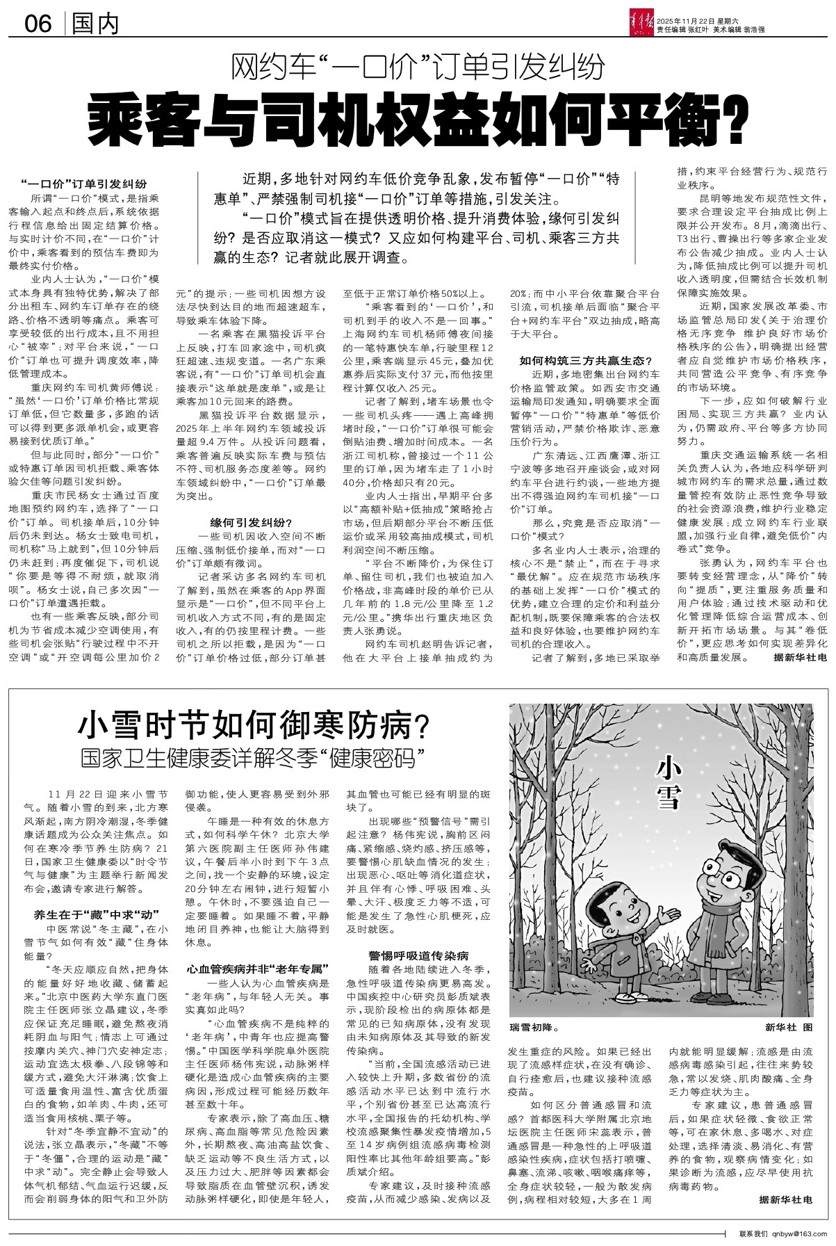 11月22日迎来小雪节气。随着小雪的到来,北方寒风渐起,南方阴冷潮湿,冬季健康话题成为公众关注焦点。如何在寒冷季节养生防病?21日,国家卫生健康委以“时令节气与健康”为主题举行新闻发布会,邀