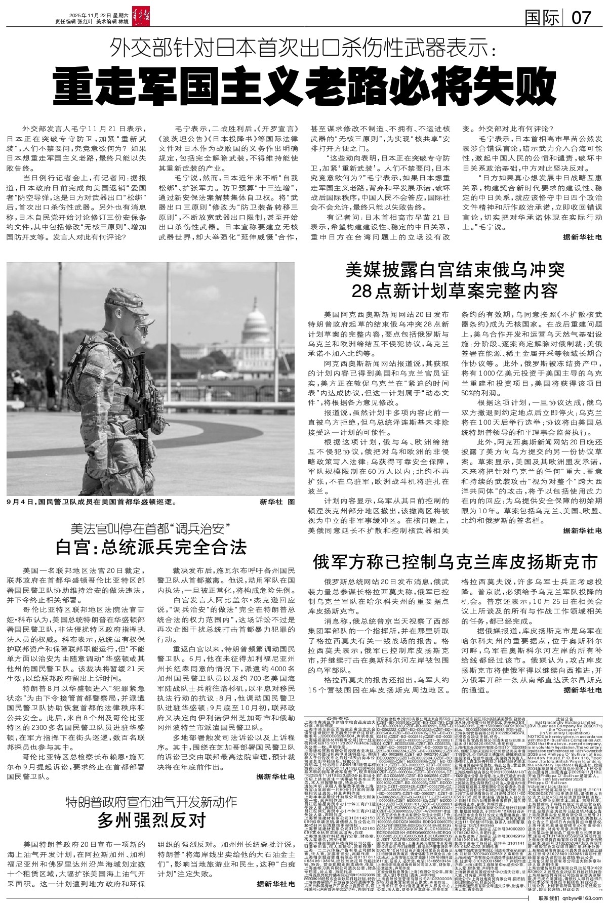 - 白宫:总统派兵完全合法 美国一名联邦地区法官20日裁定,联邦政府在首都华盛顿哥伦比亚特区部署国民警卫队协助维持治安的做法违法,并下令终止相关部署。 哥伦比亚特区联邦地区法院法官吉娅·科布认为,美国总统特朗