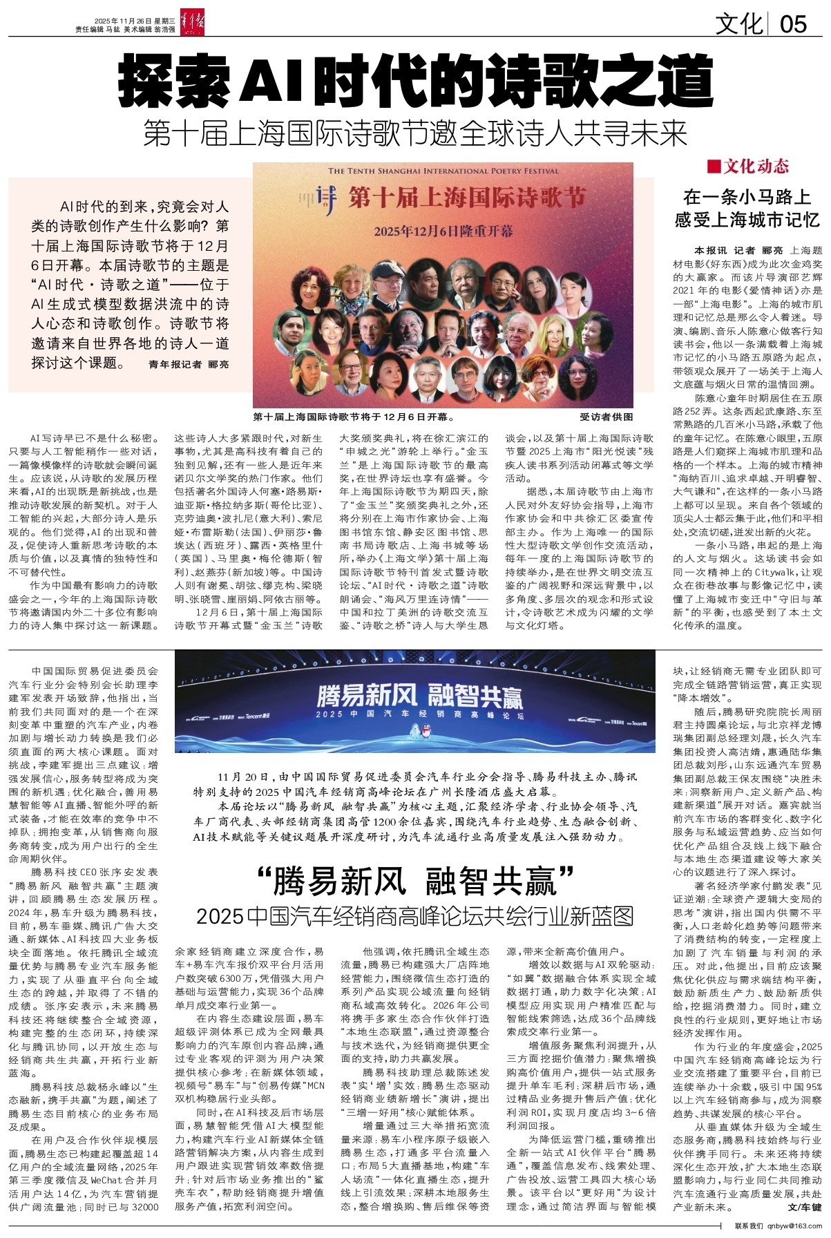- 探索AI时代的诗歌之道 AI时代的到来,究竟会对人类的诗歌创作产生什么影响?第十届上海国际诗歌节将于12月6日开幕。本届诗歌节的主题是“AI时代・诗歌之道”——位于AI生成式模型数据洪流中的诗人心态和诗歌创作。诗歌
