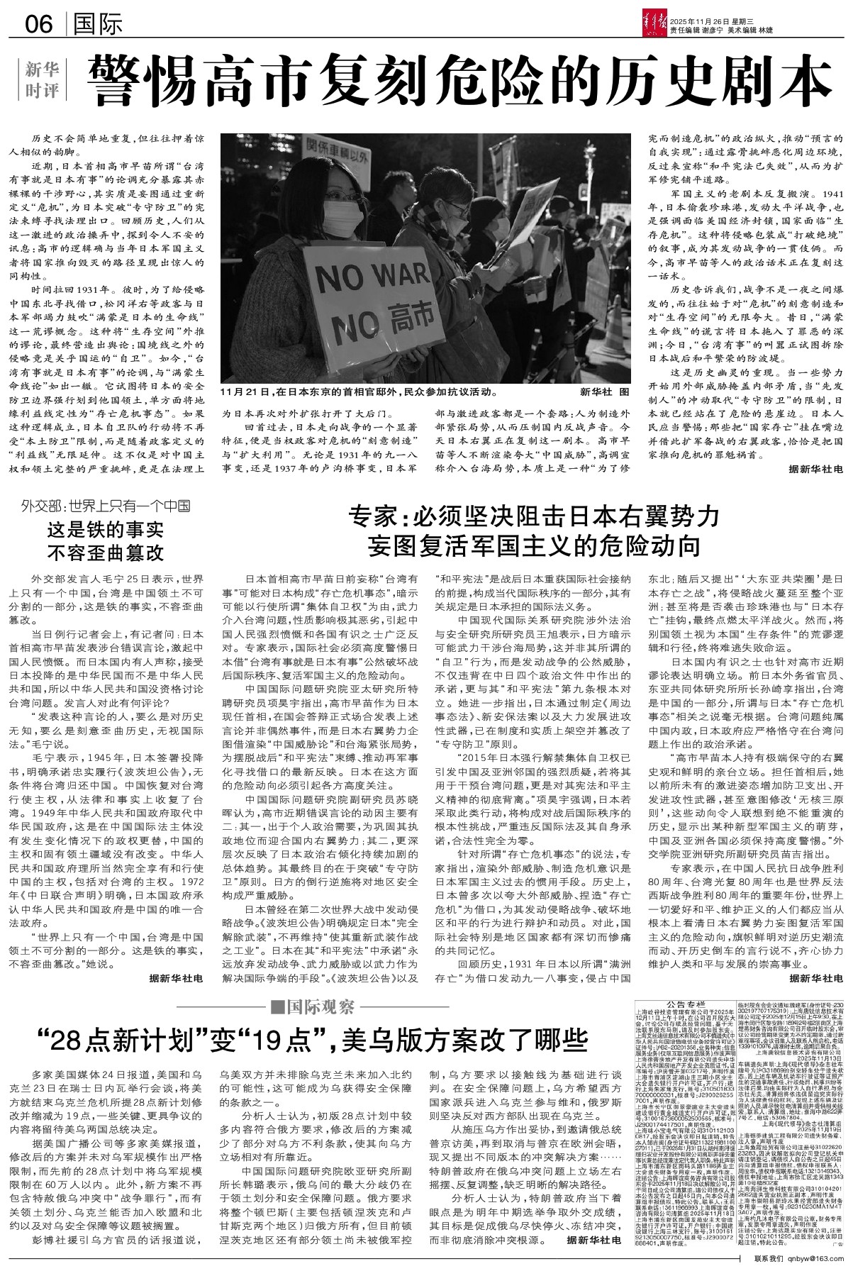 - 专家:必须坚决阻击日本右翼势力妄图复活军国主义的危险动向 日本首相高市早苗日前妄称“台湾有事”可能对日本构成“存亡危机事态”,暗示可能以行使所谓“集体自卫权”为由,武力介入台湾问题,性质影响极其恶劣,引起中国人民强烈愤慨和各国有识之士广泛反对。专家