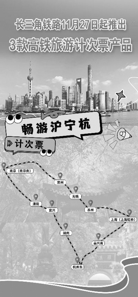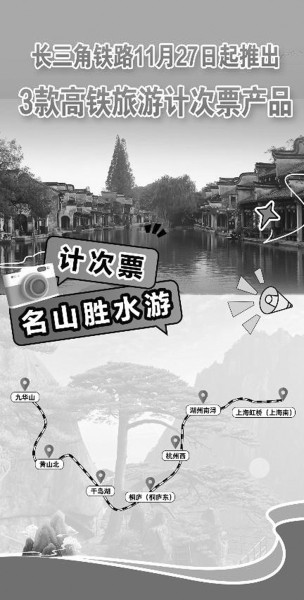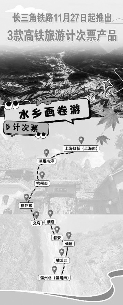 记者从中国铁路上海局集团有限公司(以下简称上铁集团)获悉,此次推出的“畅游沪宁杭”“名山胜水游”“水乡画卷游”3款旅游计次票产品,涉及宁杭高铁、沪苏湖高铁、杭温高铁、杭黄高铁、沪宁城际等5条高铁线路的26座车站,以“1次购买、分段乘坐、15天有效”的全新组合售卖模式,为广大旅客提供便利、优惠、自由的乘车新体验。
