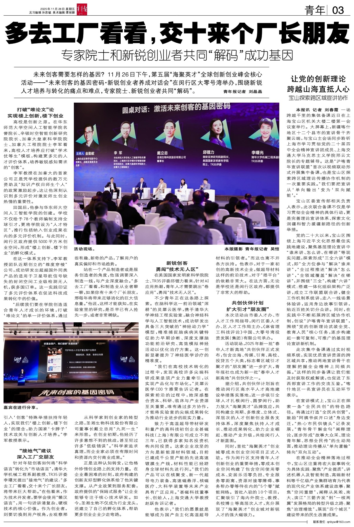 - 多去工厂看看,交十来个厂长朋友 未来创客需要怎样的基因?11月26日下午,第五届“海聚英才”全球创新创业峰会核心活动——“未来创客的基因密码·新锐创业者养成对话会”在闵行区大零号湾举办,围绕新锐人才培养与转化的痛点和难点,