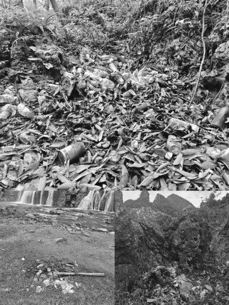 瀑布下游林间的一处天然洞穴内,堆积着数十个一次性餐盒、塑料水杯、玻璃瓶和矿泉水瓶;洞穴对面的石缝中,可见一大袋垃圾和多个塑料水瓶、易拉罐。在一条小路旁的林间,枯树枝下有不少塑料瓶、易拉罐,垃圾焚烧后的黑色残留物夹杂其间。