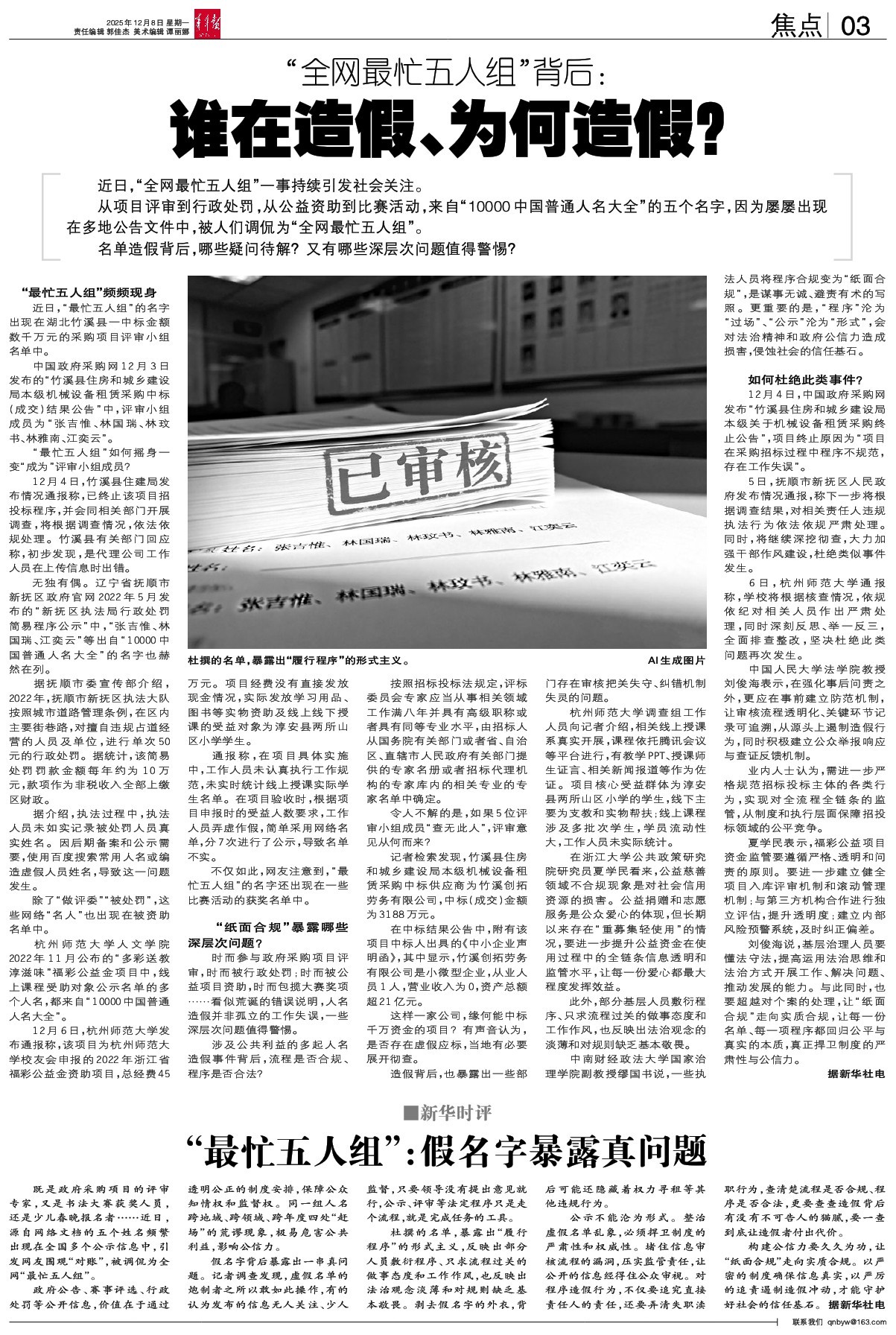 近日,“全网最忙五人组”一事持续引发社会关注。 从项目评审到行政处罚,从公益资助到比赛活动,来自“10000中国普通人名大全”的五个名字,因为屡屡出现在多地公告文件中,被人们调侃为
