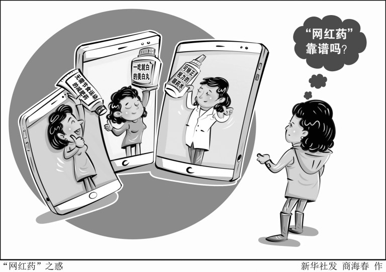 无须节食运动的减肥药、一吃就白的美白丸、可矫正视力的眼药水……近年来,不少“网红药”风靡市场。直播间内的“限时抢购”、社交平台上的“种草攻略”、朋友圈里的“熟人背书”,吸引网民跟风购买。