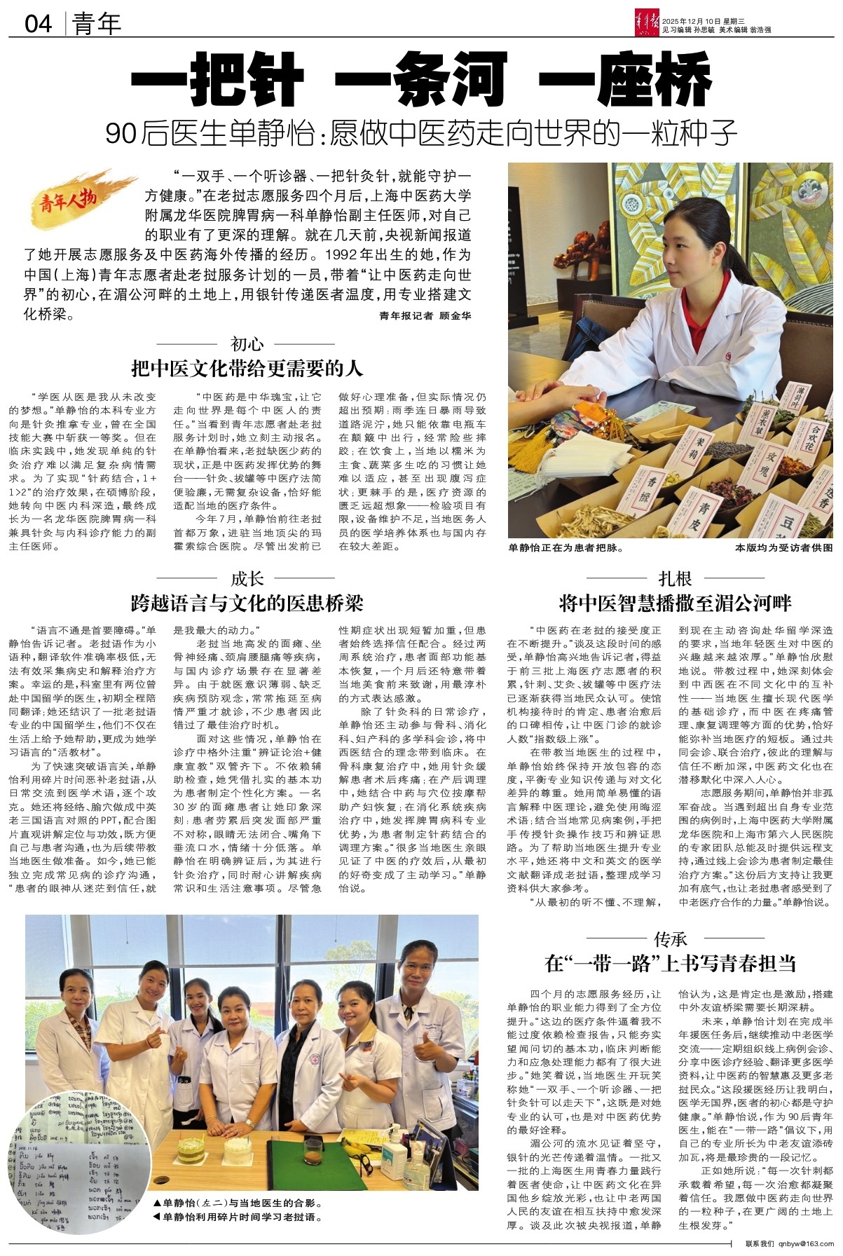“一双手、一个听诊器、一把针灸针,就能守护一方健康。”在老挝志愿服务四个月后,上海中医药大学附属龙华医院脾胃病一科单静怡副主任医师,对自己的职业有了更深的理解。就在几天前,央视新闻报道了她开