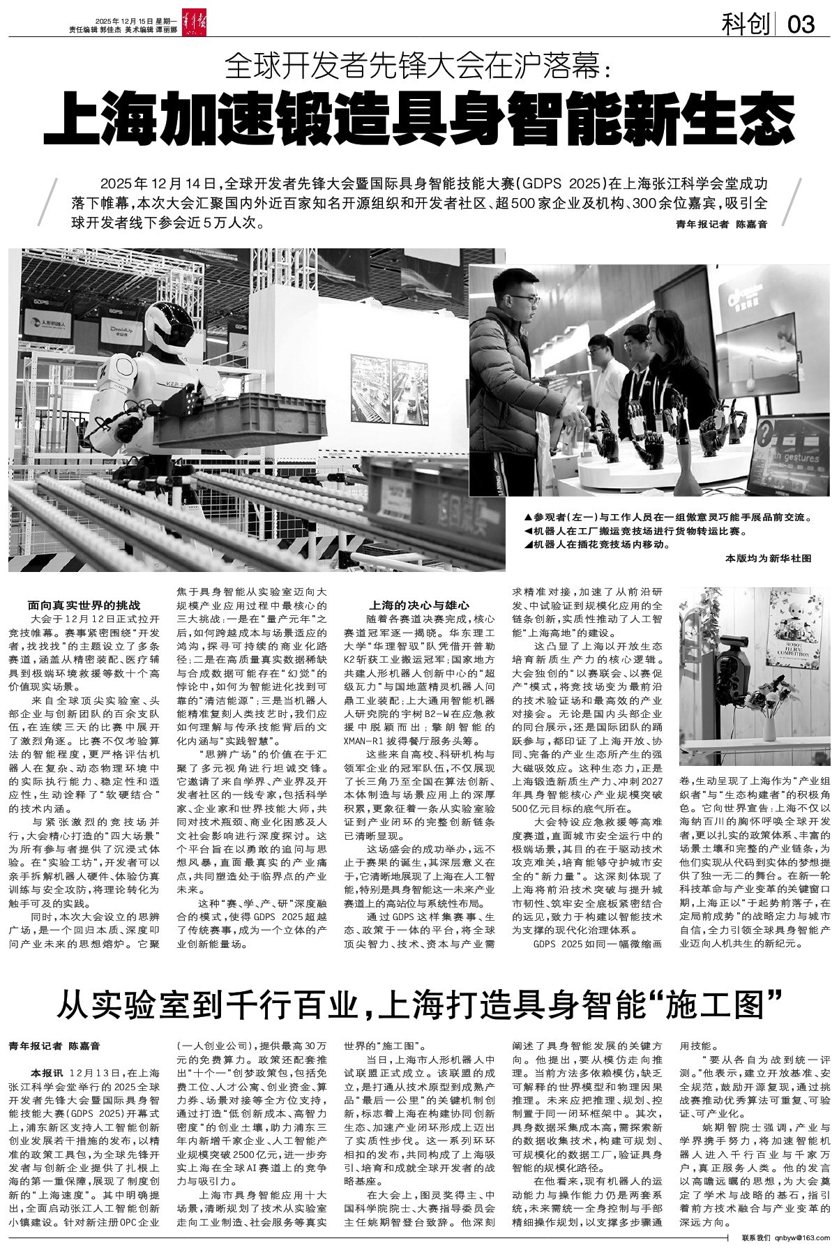 - 从实验室到千行百业,上海打造具身智能“施工图” 青年报记者 陈嘉音 本报讯12月13日,在上海张江科学会堂举行的2025全球开发者先锋大会暨国际具身智能技能大赛(GDPS2025)开幕式上,浦东新区支持人工智能创新创业发展若干措