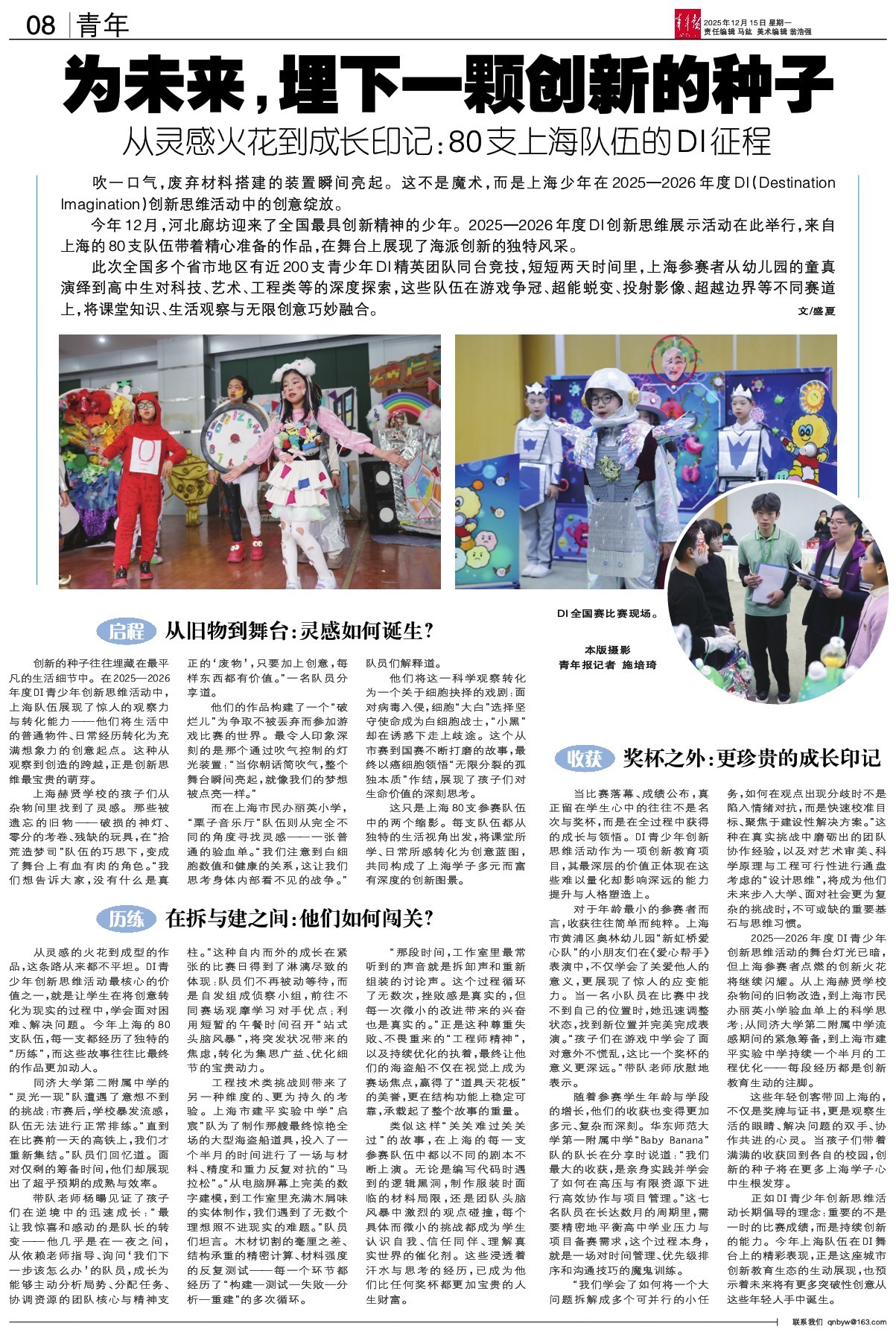 吹一口气,废弃材料搭建的装置瞬间亮起。这不是魔术,而是上海少年在2025—2026年度DI(Destination Imagination)创新思维活动中的创意绽放。 今年12月,