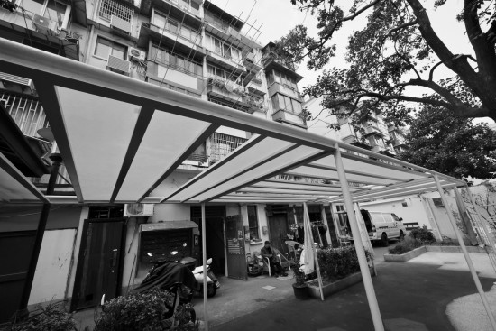 给亭子加顶,是整个项目的技术难点。面对老旧的原有结构,团队反复进行受力分析,与结构工程师商讨,最终采用轻质材料完成了顶棚加建,既保证安全,又让光线柔和洒下。