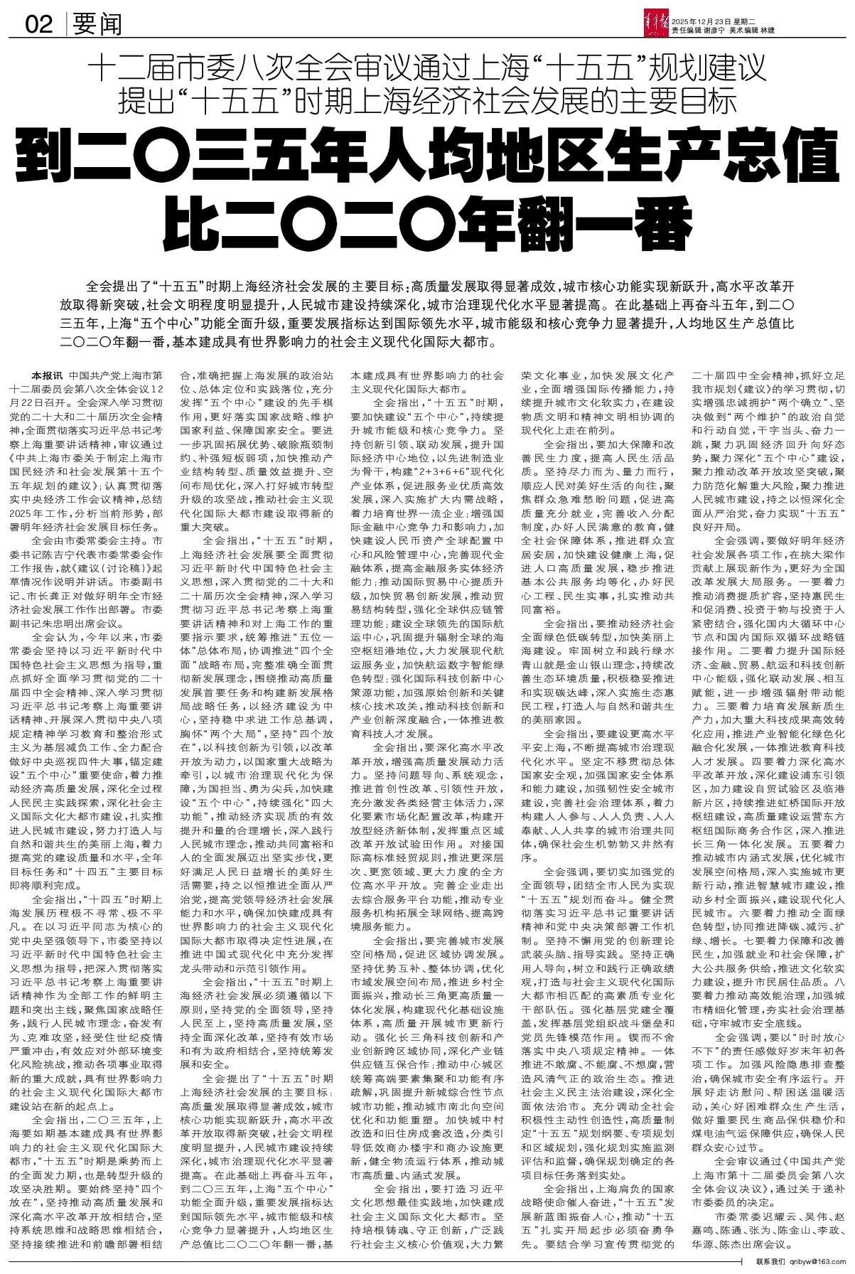全会提出了“十五五”时期上海经济社会发展的主要目标:高质量发展取得显著成效,城市核心功能实现新跃升,高水平改革开放取得新突破,社会文明程度明显提升,人民城市建设持续深化,城市治理现代化水平显