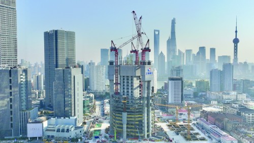 规划高度480米的北外滩91街坊项目主体结构日前突破100米高度。受访者供图
