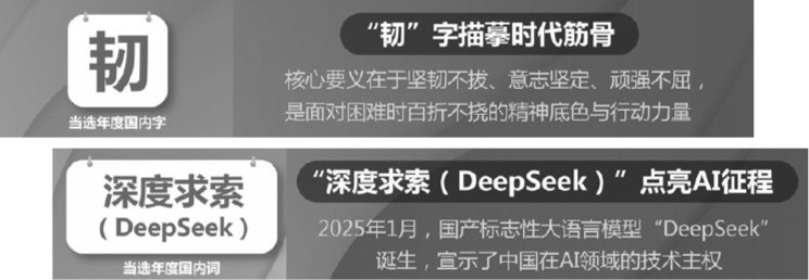 国家语言资源监测与研究中心、商务印书馆、新华网联合主办的“汉语盘点2025”活动揭晓了“韧”“深度求索(DeepSeek)”这对年度国内字词,同时发布了人形机器人、苏超、票根经济等年度十大媒体热词,杭州六小龙、育儿补贴、拉布布等年度十大新词语,敬自己一杯、助我破鼎、情绪价值等年度十大网络流行语。