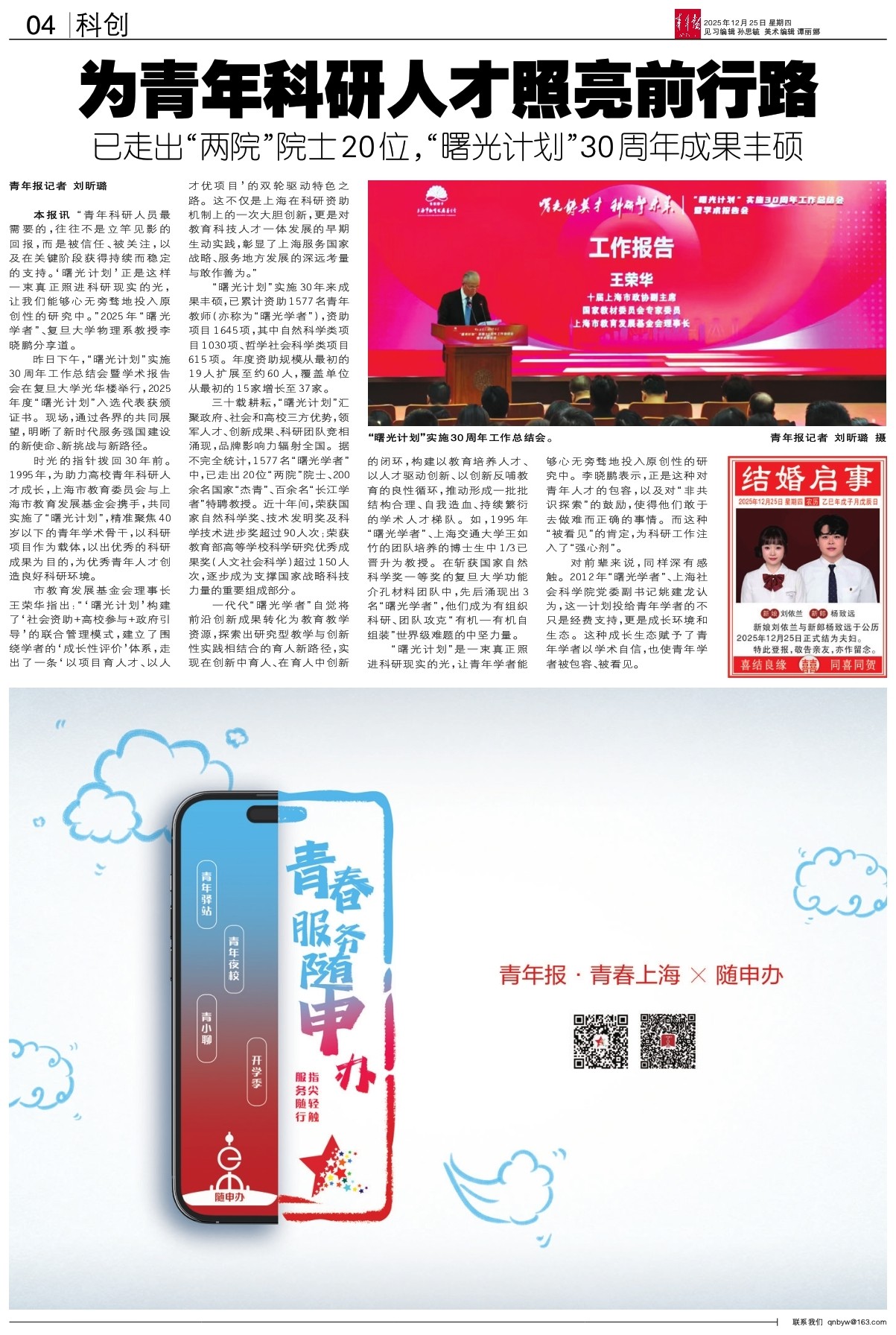 青年报记者 刘昕璐 本报讯 “青年科研人员最需要的,往往不是立竿见影的回报,而是被信任、被关注,以及在关键阶段获得持续而稳定的支持。‘曙光计划’正是这样一束真正照进科研现实的光,让