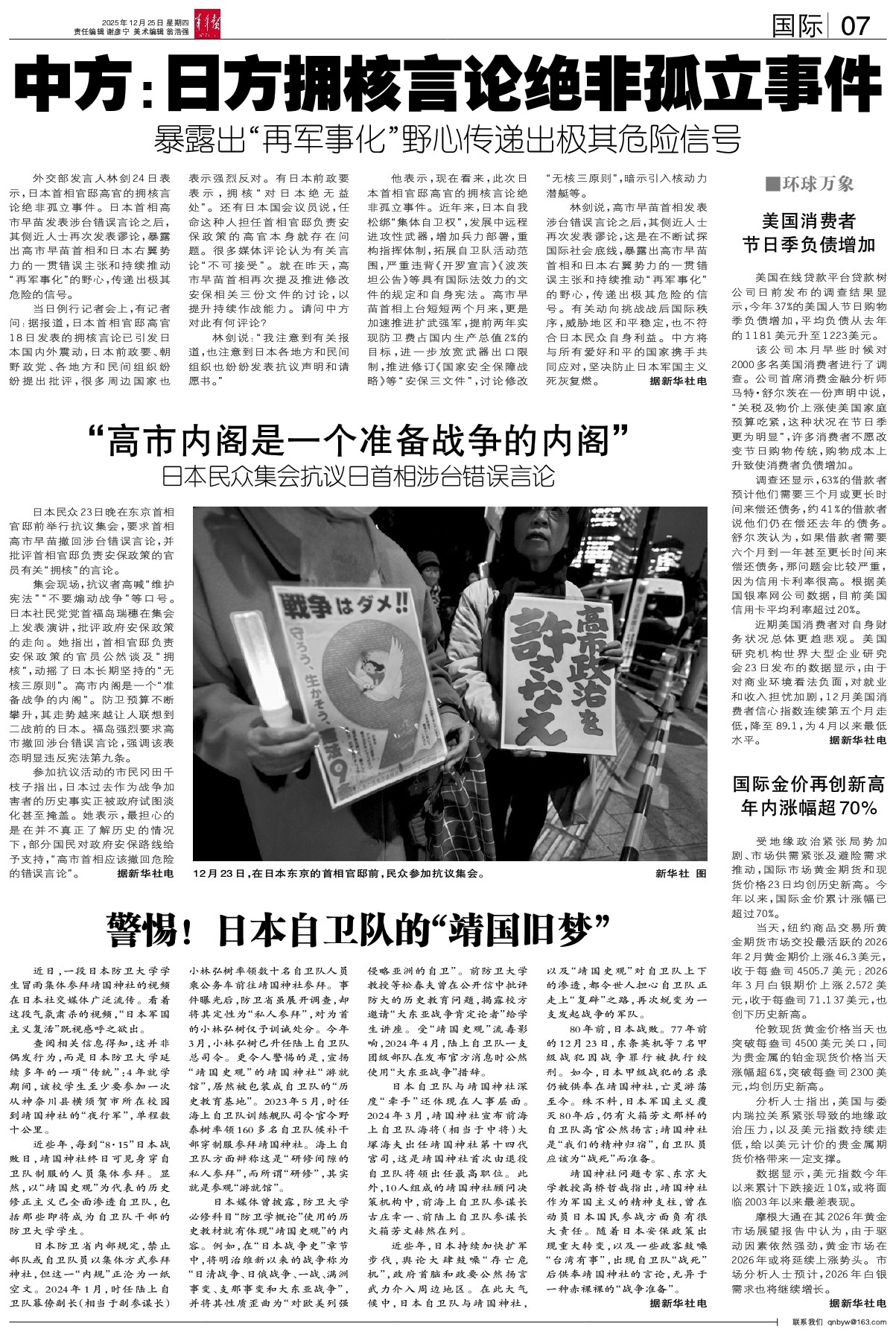 - “高市内阁是一个准备战争的内阁” 日本民众23日晚在东京首相官邸前举行抗议集会,要求首相高市早苗撤回涉台错误言论,并批评首相官邸负责安保政策的官员有关“拥核”的言论。 集会现场,抗议者高喊“维护宪法”“不要煽动战争