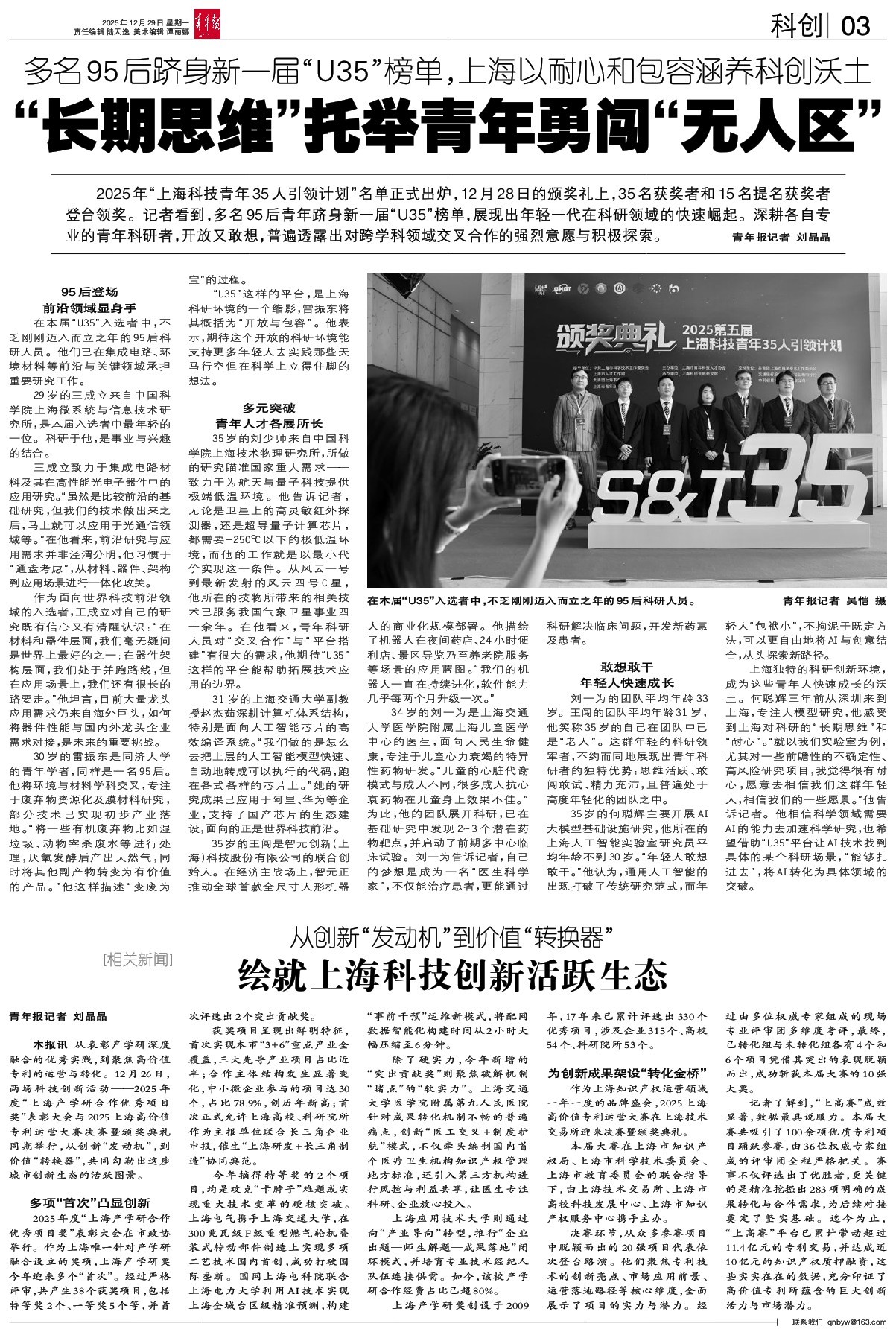 - “长期思维”托举青年勇闯“无人区” 2025年“上海科技青年35人引领计划”名单正式出炉,12月28日的颁奖礼上,35名获奖者和15名提名获奖者登台领奖。记者看到,多名95后青年跻身新一届“U35”榜单,展现出年轻一代在科研领