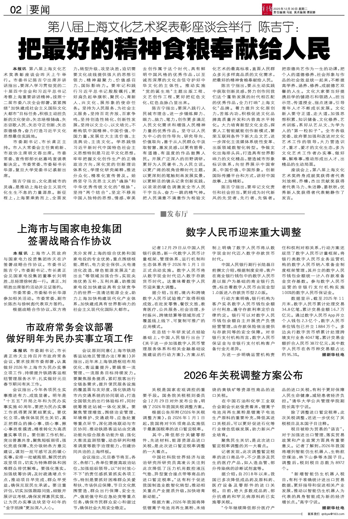 - 市政府常务会议部署做好明年为民办实事立项工作 本报讯 市委副书记、市长龚正昨天主持召开市政府常务会议,要求按照市委部署,认真做好2026年上海市为民办实事立项工作;持续提升铁路客运枢纽管理服务水平;扎实做好元旦春节期间有关工作。