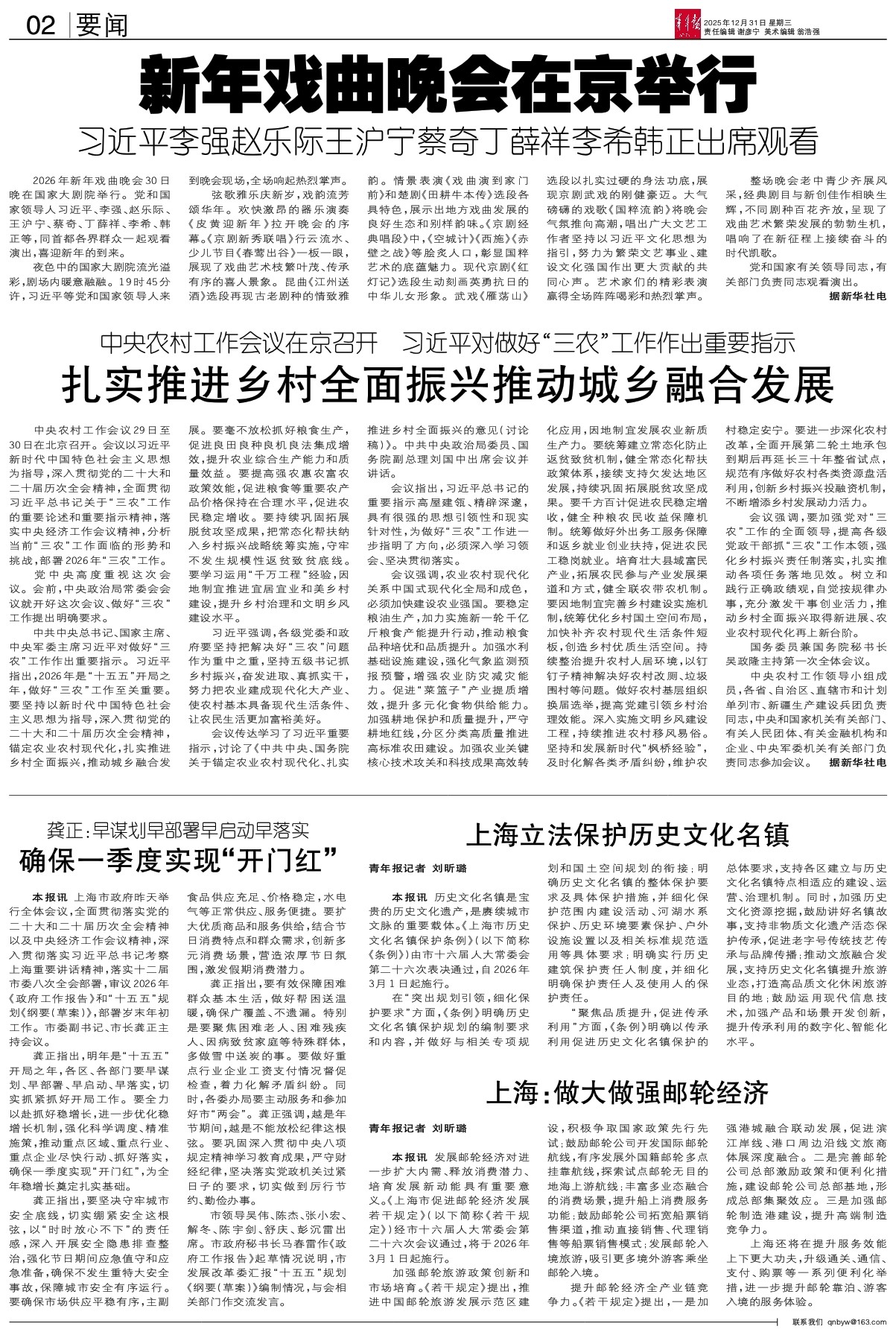 - 新年戏曲晚会在京举行 2026年新年戏曲晚会30日晚在国家大剧院举行。党和国家领导人习近平、李强、赵乐际、王沪宁、蔡奇、丁薛祥、李希、韩正等,同首都各界群众一起观看演出,喜迎新年的到来。 夜色中的国家大