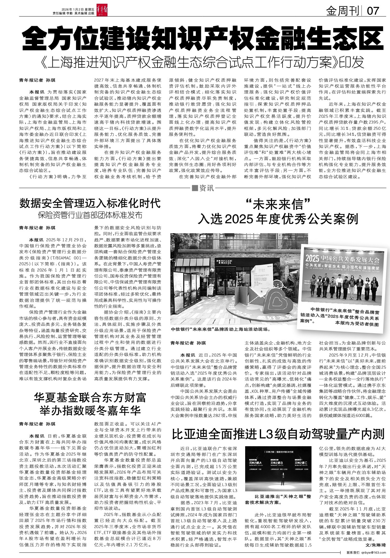 - 全方位建设知识产权金融生态区 青年报记者 孙琪 本报讯 为贯彻落实《国家金融监督管理总局 国家知识产权局 国家版权局关于印发〈知识产权金融生态综合试点工作方案〉的通知》要求,结合上海实际,上海市金融监管局、上