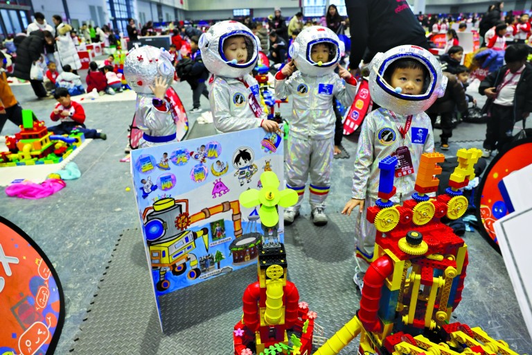 一场关于太阳能设备的演示,正在几名身着“中国航天”宇航服的小队员讲解下展开。这支“航天小队”平均年龄仅5岁,他们面前的不是精密机械,而是全部由积木搭建而成的科学装置。这座红黄相间的小型建筑,由齿轮与管道精巧组成,形成一套三层循环系统,涵盖资源开采、传输与转化全流程。“我们的项目叫‘泰坦救援’,坠落的矿石可通过倾倒装置送入收集舱,采用水平与垂直传动设计,再对收集到的矿石进行转化。”负责资源开采环节的张宥儒一边介绍,一边将积木放入纸杯,只见吊臂缓缓升起,将“矿石”倾倒入舱。