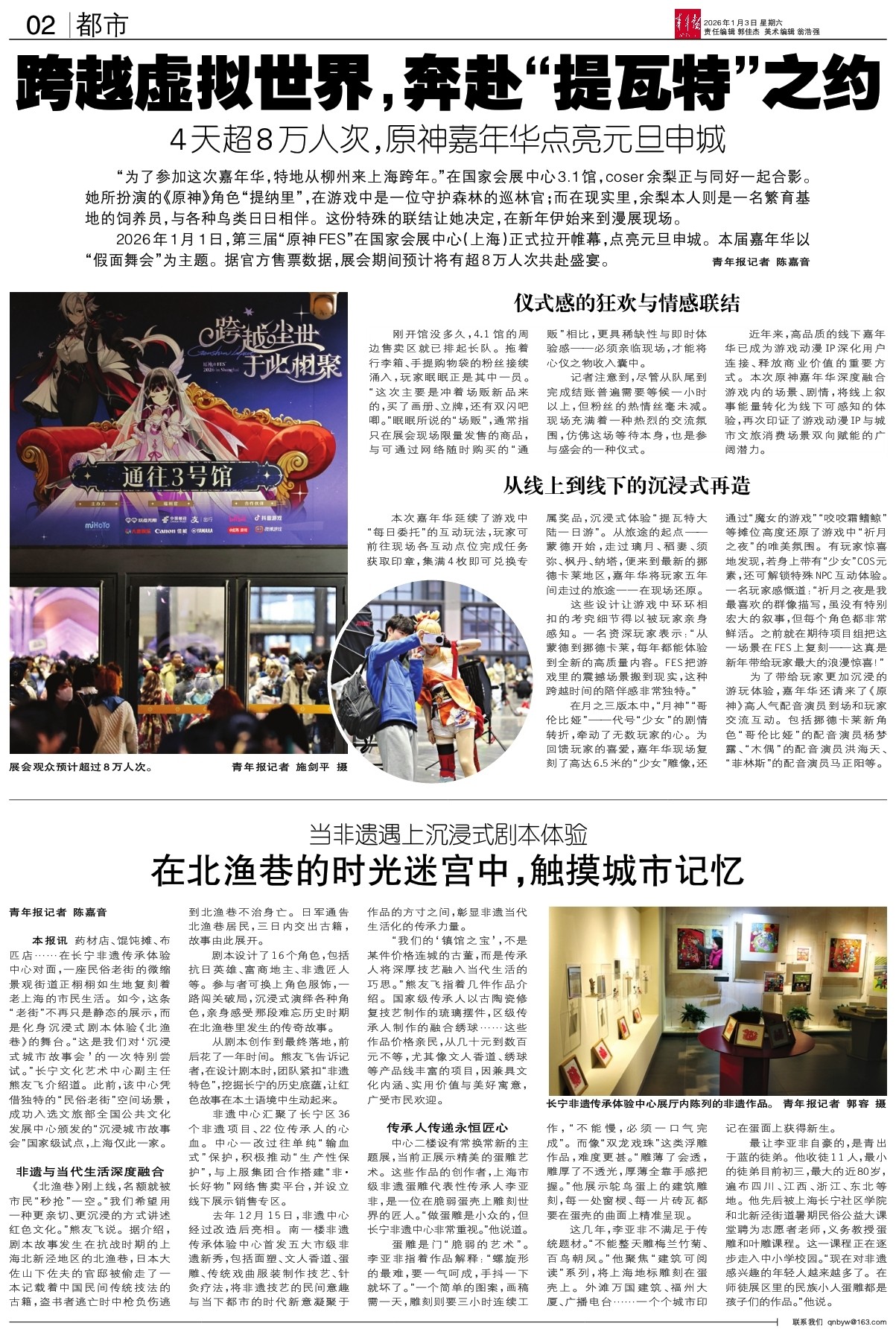 “为了参加这次嘉年华,特地从柳州来上海跨年。”在国家会展中心3.1馆,coser余梨正与同好一起合影。她所扮演的《原神》角色“提纳里”,在游戏中是一位守护森林的巡林官;而在现实里,余梨本人则