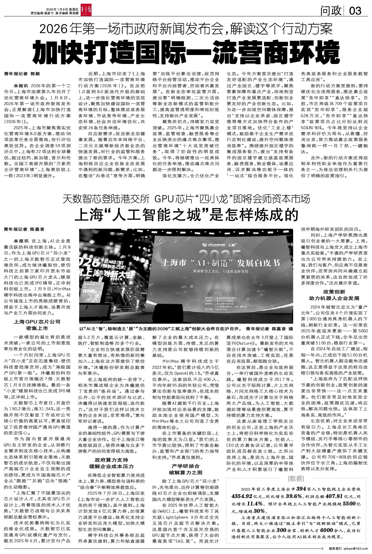 青年报记者 郭颖 本报讯2026年的第一个工作日,上海市连续第九年召开了优化营商环境大会。1月8日,2026年第一场市政府新闻发布会,正是解读《上海市加快打造国际一流营商环境行动方