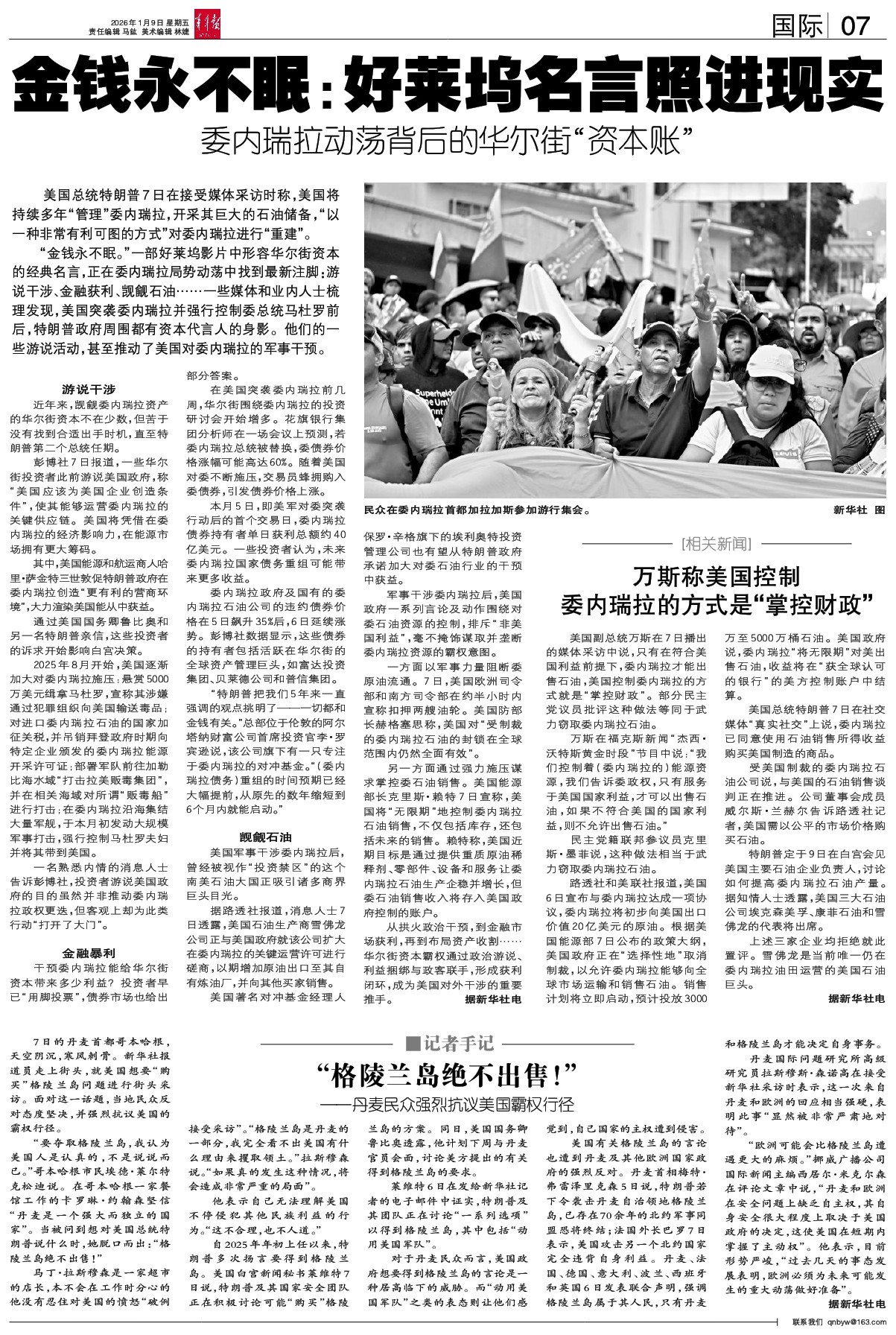 - 金钱永不眠:好莱坞名言照进现实 美国总统特朗普7日在接受媒体采访时称,美国将持续多年“管理”委内瑞拉,开采其巨大的石油储备,“以一种非常有利可图的方式”对委内瑞拉进行“重建”。 “金钱永不眠。”一部好莱坞影片中形