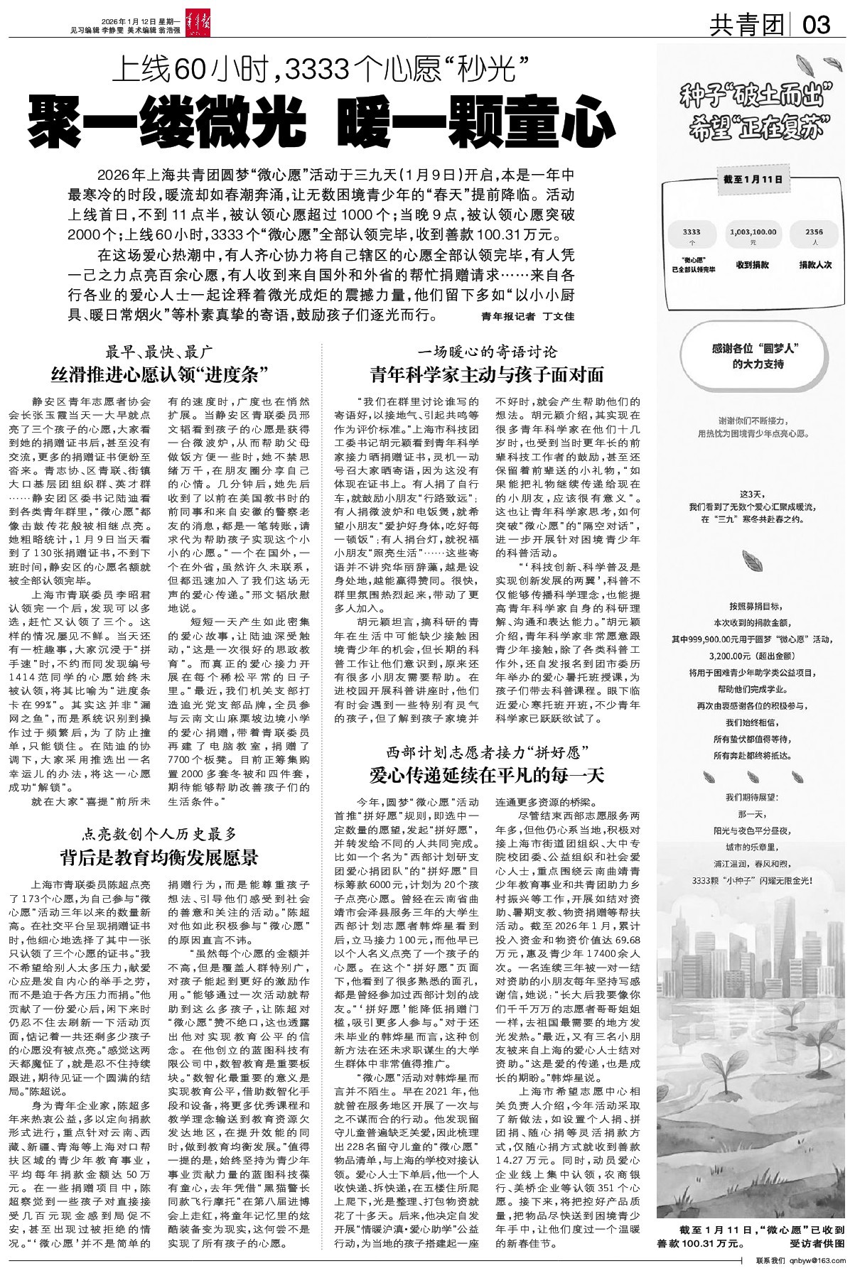 2026年上海共青团圆梦“微心愿”活动于三九天(1月9日)开启,本是一年中最寒冷的时段,暖流却如春潮奔涌,让无数困境青少年的“春天”提前降临。活动上线首日,不到11点半,被认领心愿超过100