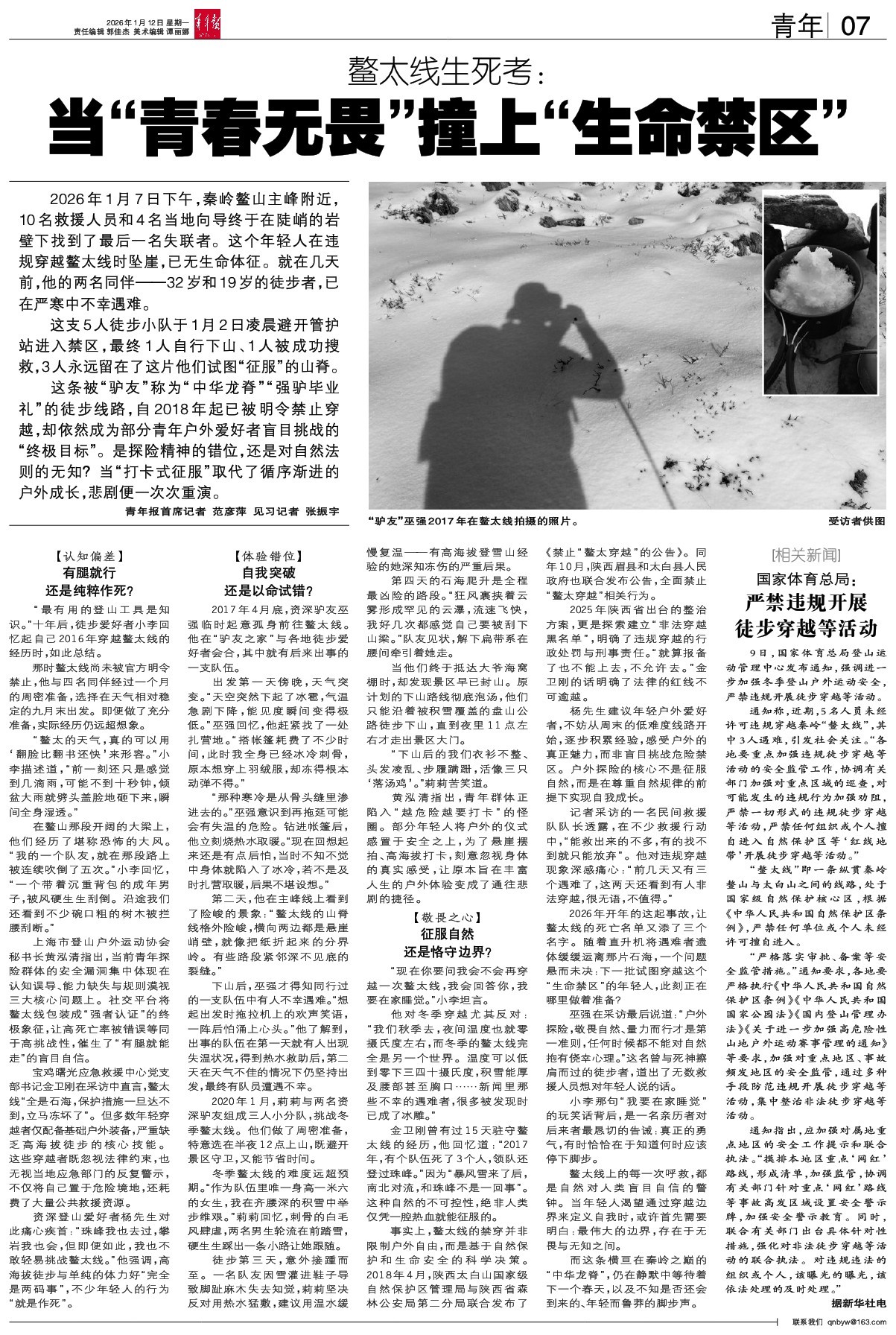 2026年1月7日下午,秦岭鳌山主峰附近,10名救援人员和4名当地向导终于在陡峭的岩壁下找到了最后一名失联者。这个年轻人在违规穿越鳌太线时坠崖,已无生命体征。就在几天前,他的两名同伴——32