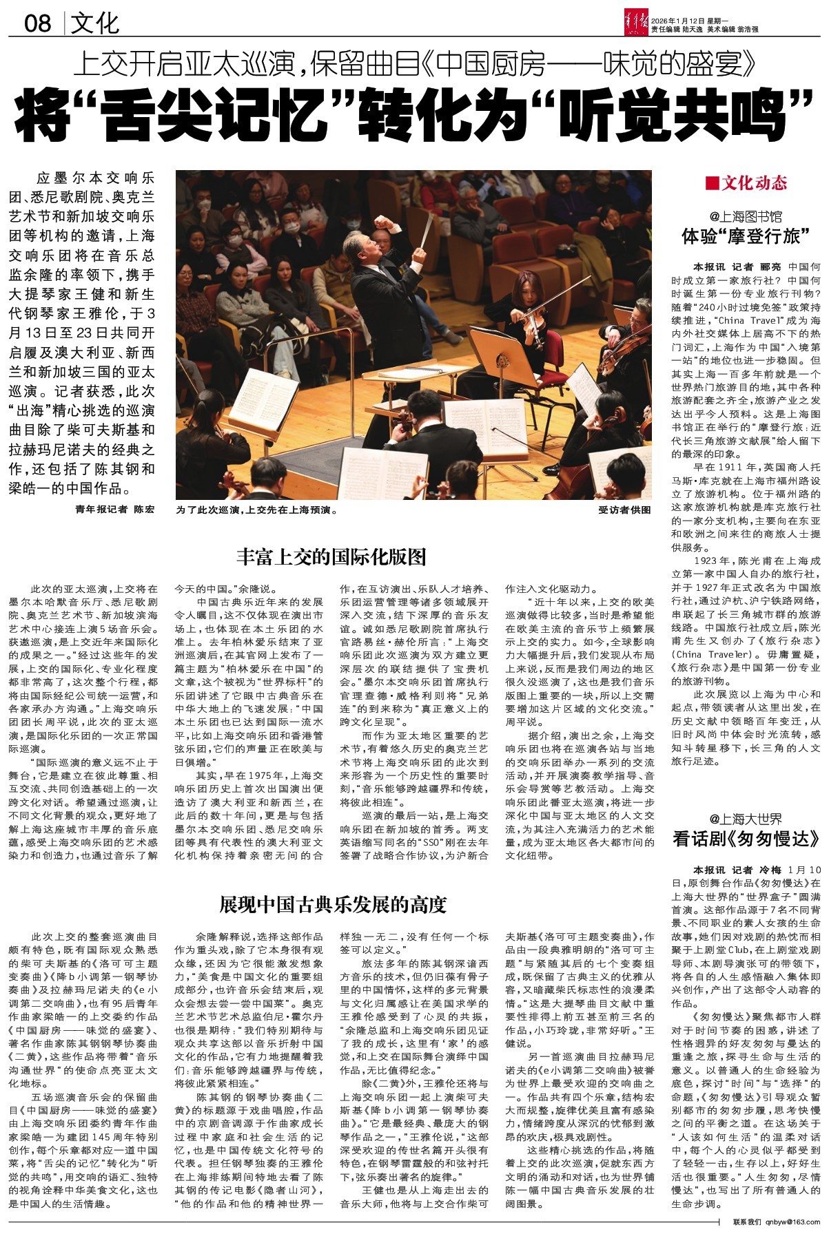 - 将“舌尖记忆”转化为“听觉共鸣” 应墨尔本交响乐团、悉尼歌剧院、奥克兰艺术节和新加坡交响乐团等机构的邀请,上海交响乐团将在音乐总监余隆的率领下,携手大提琴家王健和新生代钢琴家王雅伦,于3月13日至23日共同开启履及澳大利亚、