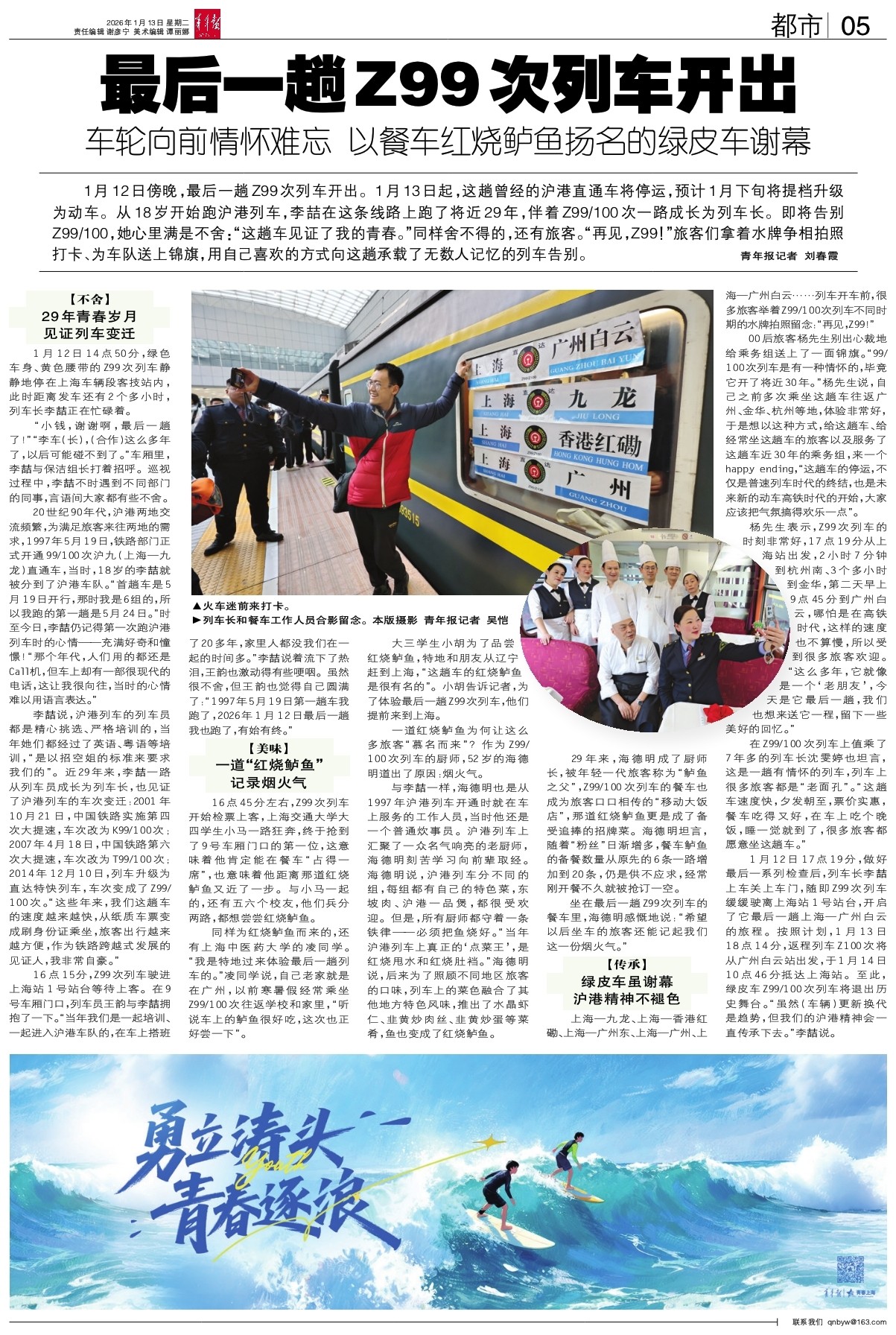 1月12日傍晚,最后一趟Z99次列车开出。1月13日起,这趟曾经的沪港直通车将停运,预计1月下旬将提档升级为动车。从18岁开始跑沪港列车,李喆在这条线路上跑了将近29年,伴着Z99/100次