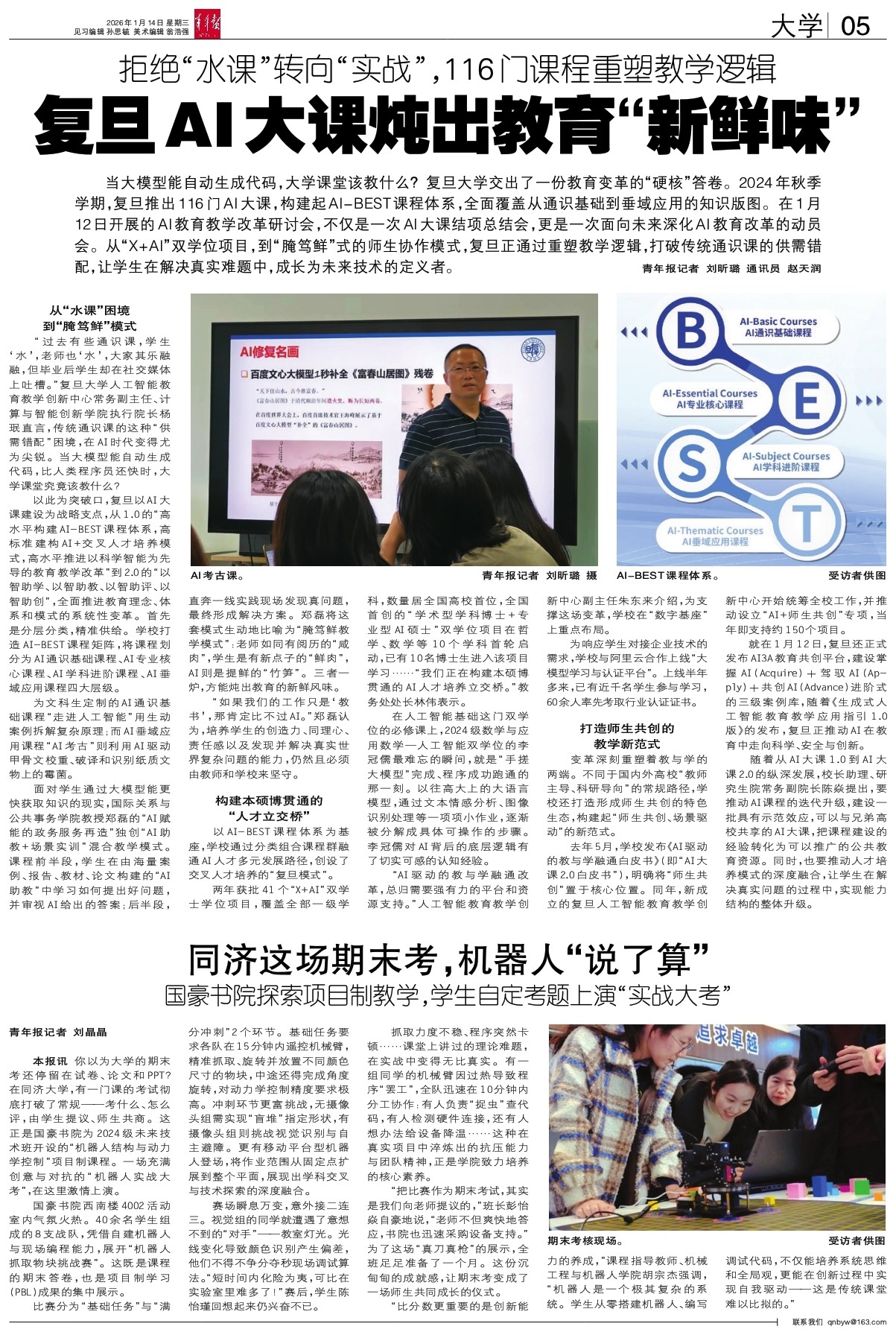 - 复旦AI大课炖出教育“新鲜味” 当大模型能自动生成代码,大学课堂该教什么?复旦大学交出了一份教育变革的“硬核”答卷。2024年秋季学期,复旦推出116门AI大课,构建起AI-BEST课程体系,全面覆盖从通识基础到垂域应用的