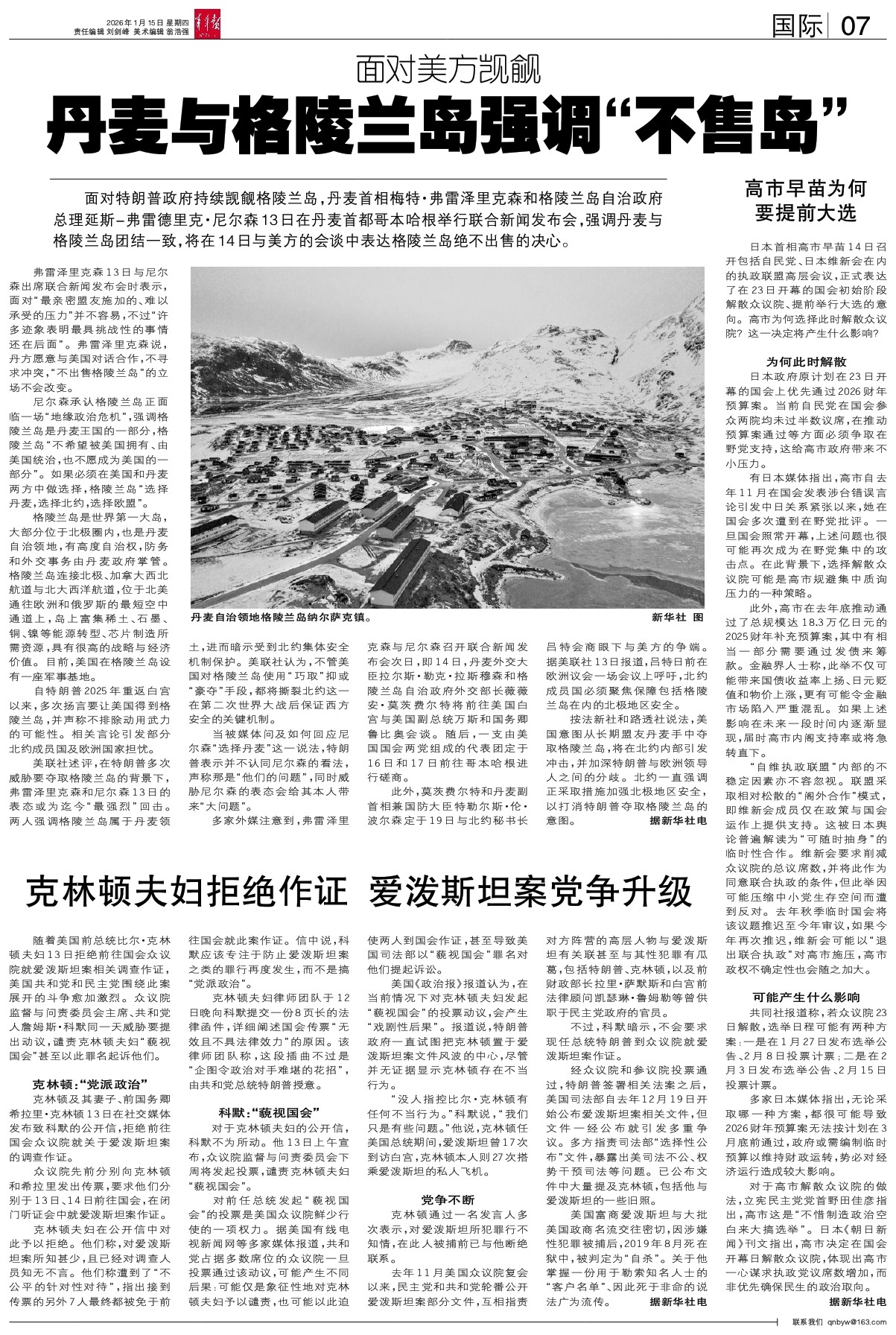 - 丹麦与格陵兰岛强调“不售岛” 面对特朗普政府持续觊觎格陵兰岛,丹麦首相梅特·弗雷泽里克森和格陵兰岛自治政府总理延斯-弗雷德里克·尼尔森13日在丹麦首都哥本哈根举行联合新闻发布会,强调丹麦与格陵兰岛团结一致,将在14日与美