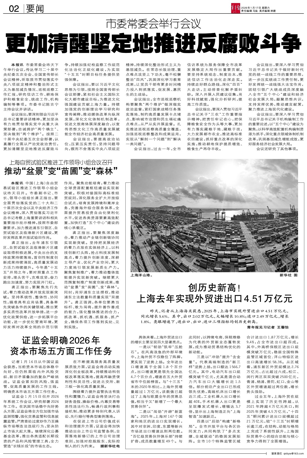 - 证监会明确2026年资本市场五方面工作任务 记者1月16日从中国证监会获悉,当前资本市场总体稳中向好,但仍然面临内外风险交织、新旧矛盾叠加的复杂严峻挑战。证监会紧扣防风险、强监管、促高质量发展的工作主线,明确资本市场五方面工作任务。