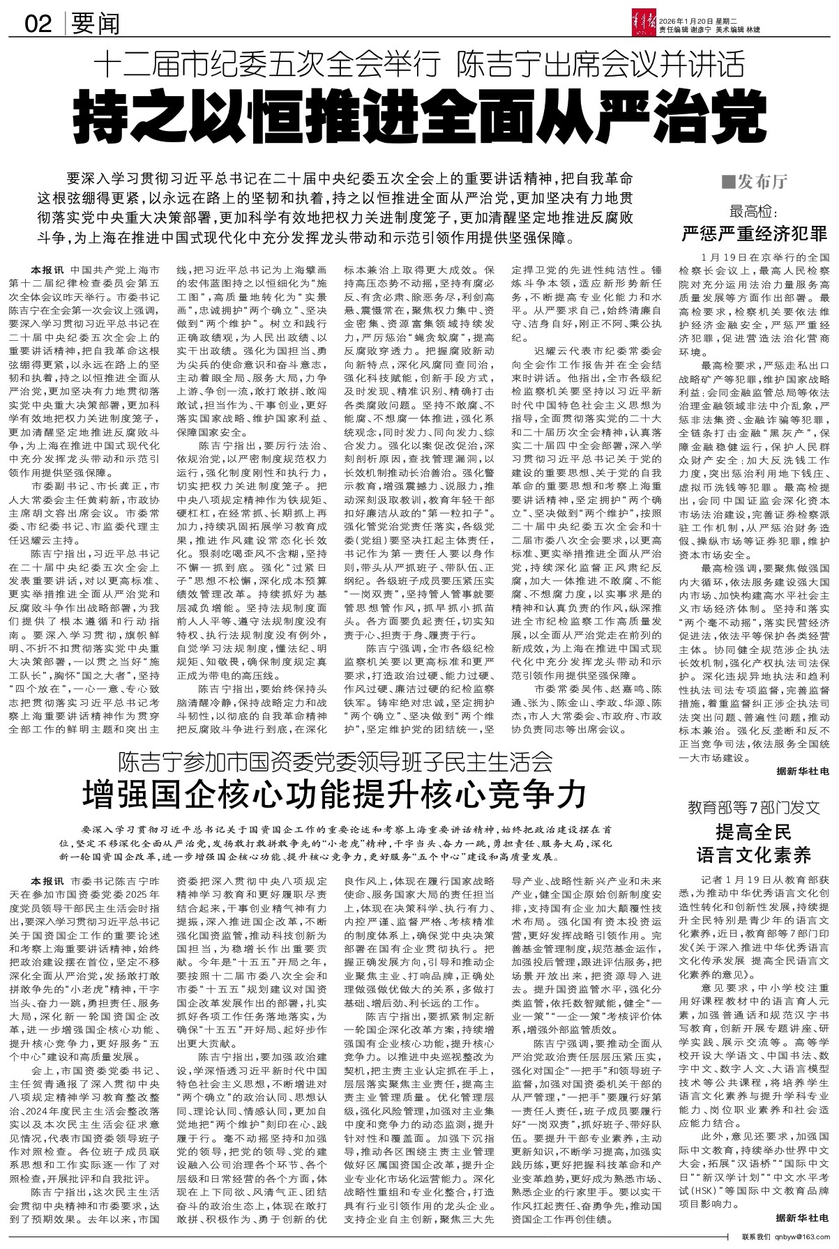 - 增强国企核心功能提升核心竞争力 要深入学习贯彻习近平总书记关于国资国企工作的重要论述和考察上海重要讲话精神,始终把政治建设摆在首位,坚定不移深化全面从严治党,发扬敢打敢拼敢争先的“小老虎”精神,干字当头、奋力一跳,勇担责任